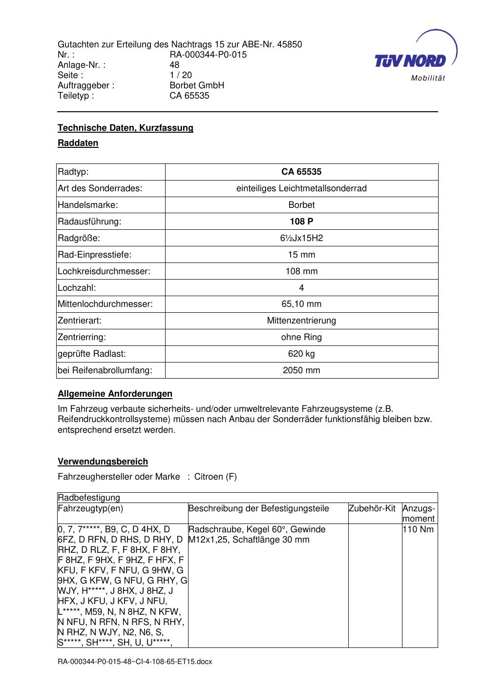 Dieses Gutachten (abe) bezieht sich auf die Alufelge Borbet CA 65535 in der Ausführung ET 0, Mittenloch 0 mm (KBA 45850). Im PDF findest du typischerweise zulässige Reifengrößen, Auflagen/Anbauhinweise und – je nach Dokument – Hinweise zur Eintragung.