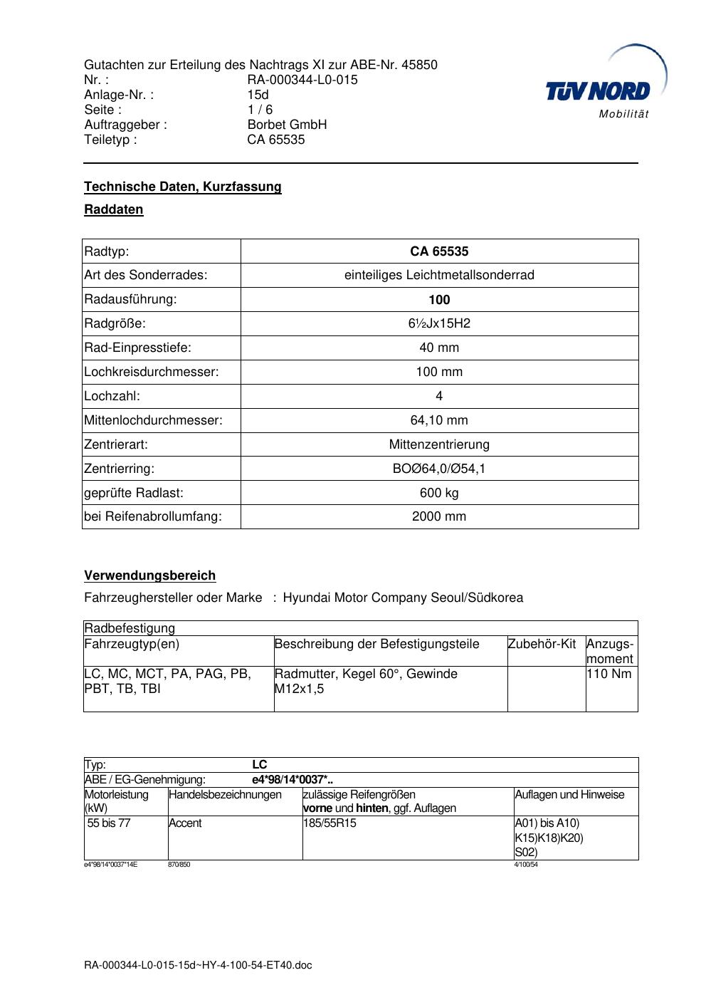 Dieses Gutachten (abe) bezieht sich auf die Alufelge Borbet CA 65535 in der Ausführung ET 0, Mittenloch 0 mm (KBA 45850). Im PDF findest du typischerweise zulässige Reifengrößen, Auflagen/Anbauhinweise und – je nach Dokument – Hinweise zur Eintragung.
