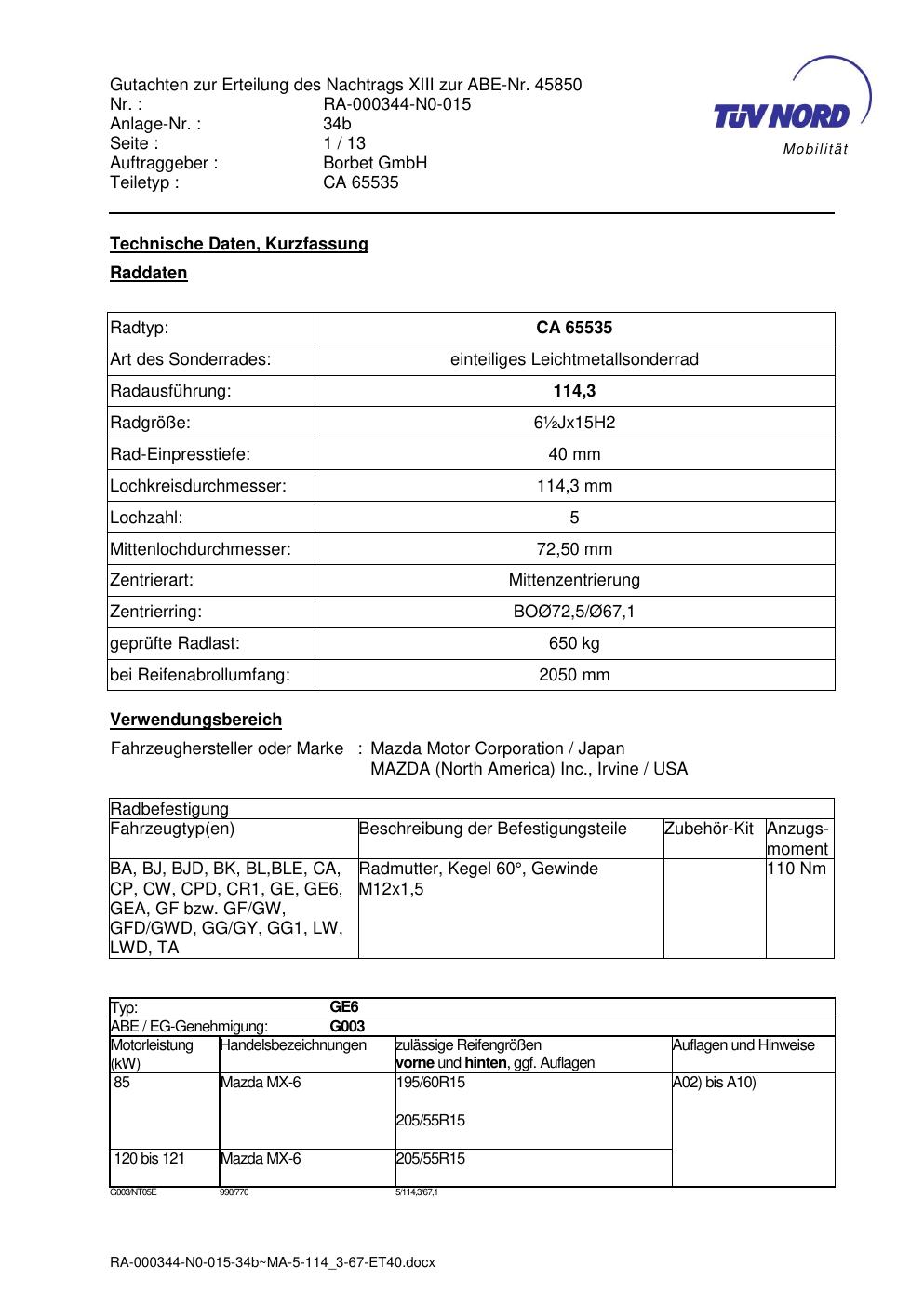 • Stimmt die KBA-Nummer auf der Felge mit diesem Dokument überein?
