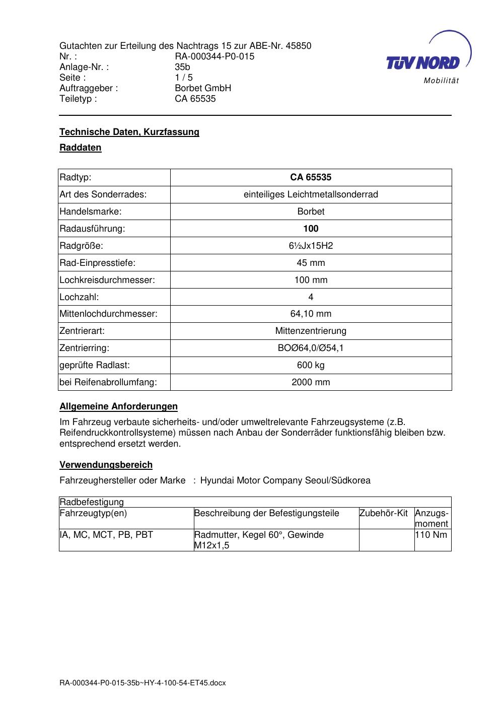 Dieses Gutachten (abe) bezieht sich auf die Alufelge Borbet CA 65535 in der Ausführung ET 0, Mittenloch 0 mm (KBA 45850). Im PDF findest du typischerweise zulässige Reifengrößen, Auflagen/Anbauhinweise und – je nach Dokument – Hinweise zur Eintragung.
