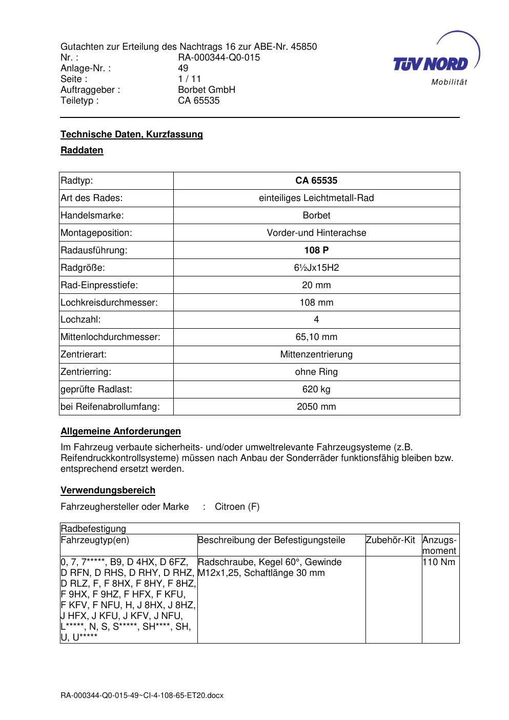 Dieses Gutachten (abe) bezieht sich auf die Alufelge Borbet CA 65535 in der Ausführung ET 0, Mittenloch 0 mm (KBA 45850). Im PDF findest du typischerweise zulässige Reifengrößen, Auflagen/Anbauhinweise und – je nach Dokument – Hinweise zur Eintragung.