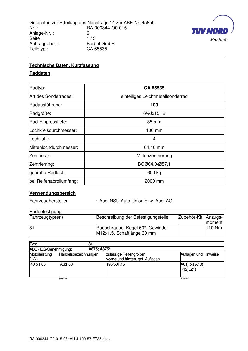 Dieses Gutachten (abe) bezieht sich auf die Alufelge Borbet CA 65535 in der Ausführung ET 0, Mittenloch 0 mm (KBA 45850). Im PDF findest du typischerweise zulässige Reifengrößen, Auflagen/Anbauhinweise und – je nach Dokument – Hinweise zur Eintragung.