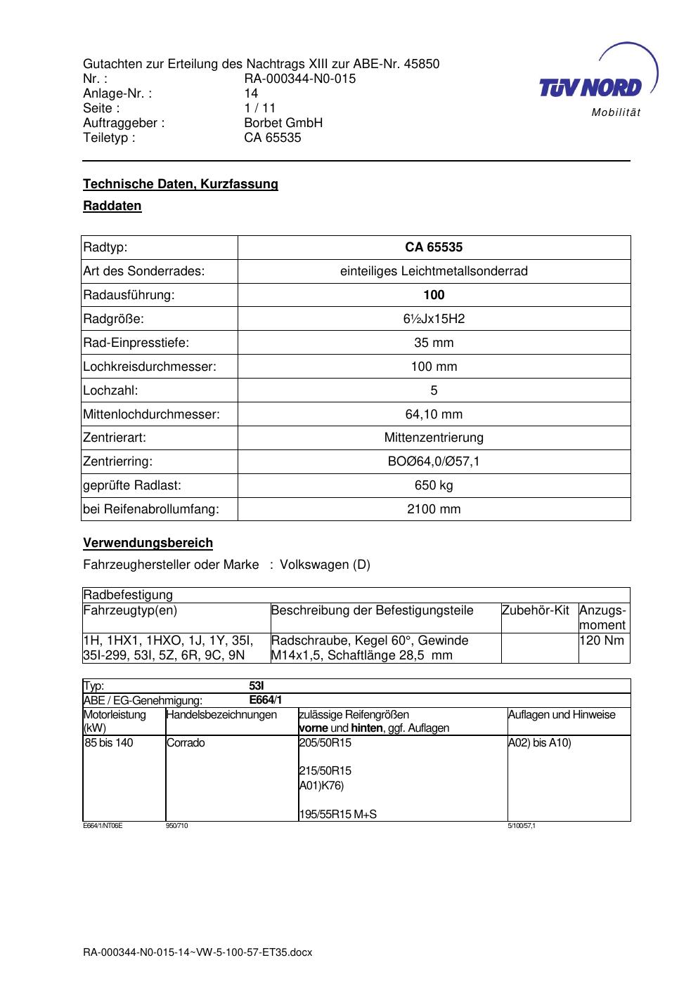 Dieses Gutachten (abe) bezieht sich auf die Alufelge Borbet CA 65535 in der Ausführung ET 0, Mittenloch 0 mm (KBA 45850). Im PDF findest du typischerweise zulässige Reifengrößen, Auflagen/Anbauhinweise und – je nach Dokument – Hinweise zur Eintragung.
