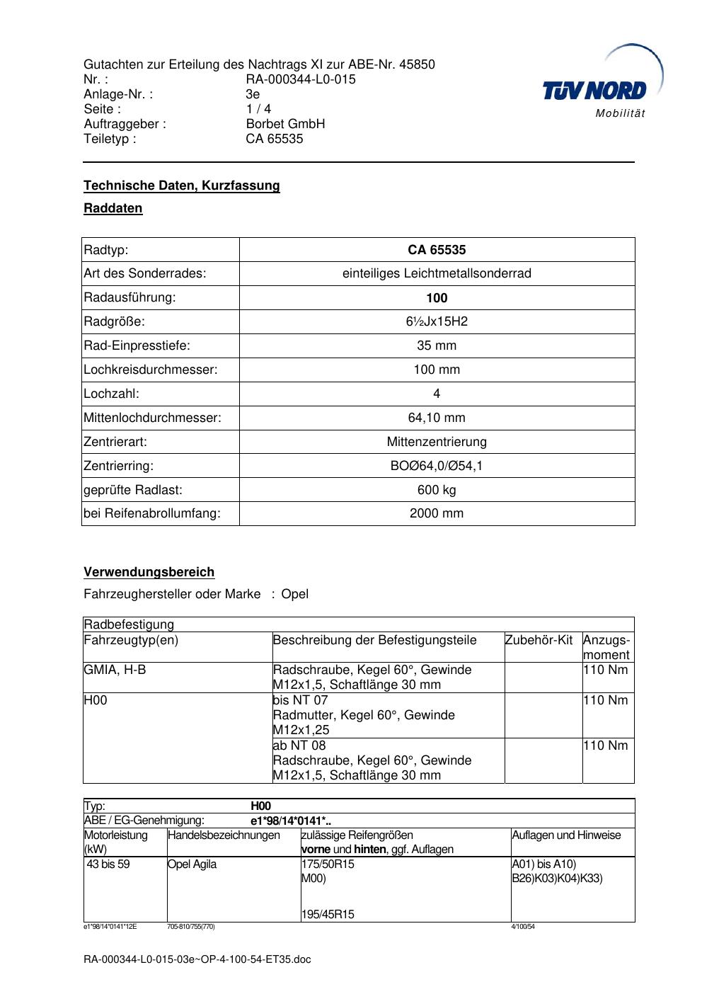Dieses Gutachten (abe) bezieht sich auf die Alufelge Borbet CA 65535 in der Ausführung ET 0, Mittenloch 0 mm (KBA 45850). Im PDF findest du typischerweise zulässige Reifengrößen, Auflagen/Anbauhinweise und – je nach Dokument – Hinweise zur Eintragung.