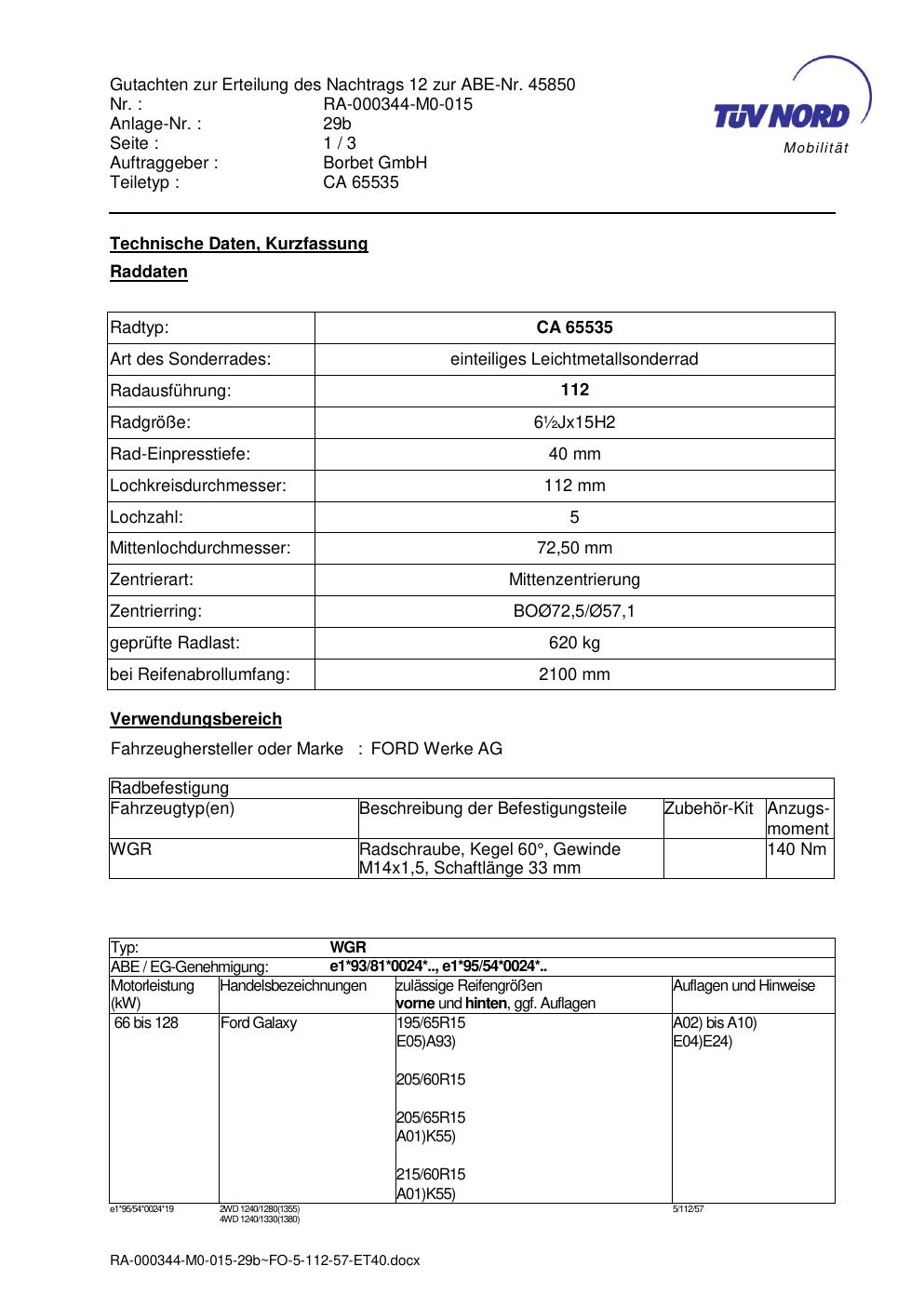 Dieses Gutachten (abe) bezieht sich auf die Alufelge Borbet CA 65535 in der Ausführung ET 0, Mittenloch 0 mm (KBA 45850). Im PDF findest du typischerweise zulässige Reifengrößen, Auflagen/Anbauhinweise und – je nach Dokument – Hinweise zur Eintragung.