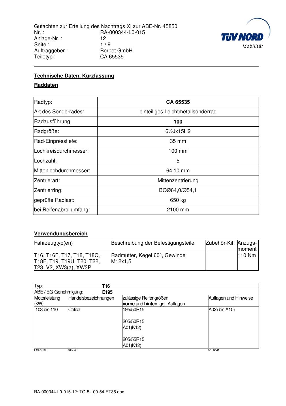 • Stimmt die KBA-Nummer auf der Felge mit diesem Dokument überein?