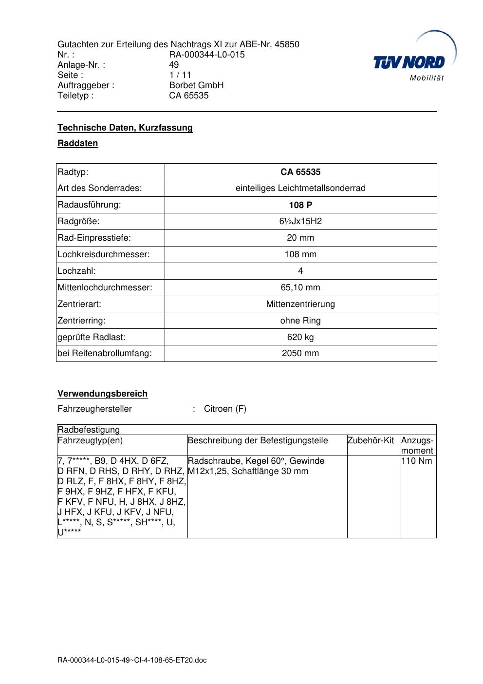 Dieses Gutachten (abe) bezieht sich auf die Alufelge Borbet CA 65535 in der Ausführung ET 0, Mittenloch 0 mm (KBA 45850). Im PDF findest du typischerweise zulässige Reifengrößen, Auflagen/Anbauhinweise und – je nach Dokument – Hinweise zur Eintragung.