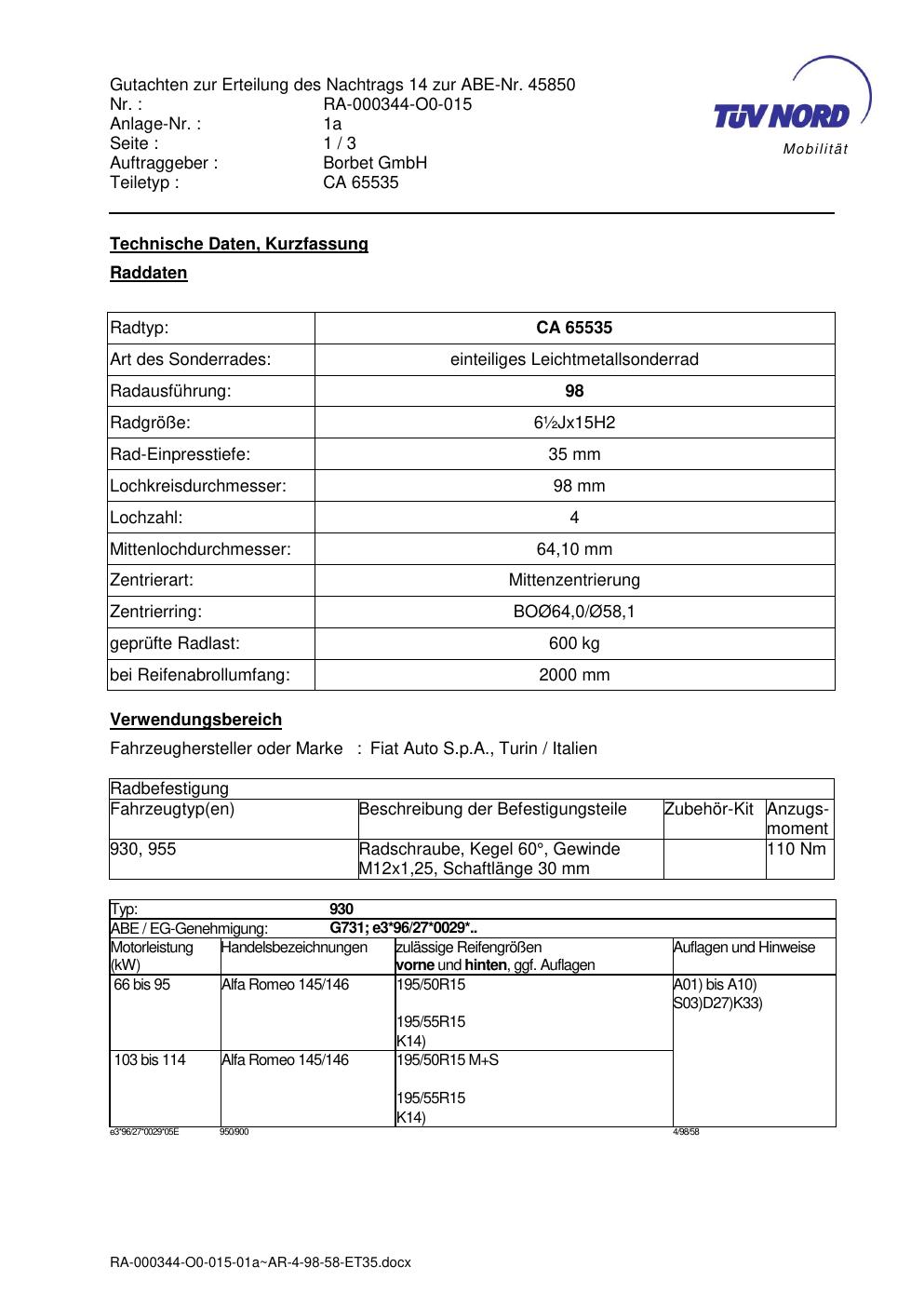 Dieses Gutachten (abe) bezieht sich auf die Alufelge Borbet CA 65535 in der Ausführung ET 0, Mittenloch 0 mm (KBA 45850). Im PDF findest du typischerweise zulässige Reifengrößen, Auflagen/Anbauhinweise und – je nach Dokument – Hinweise zur Eintragung.