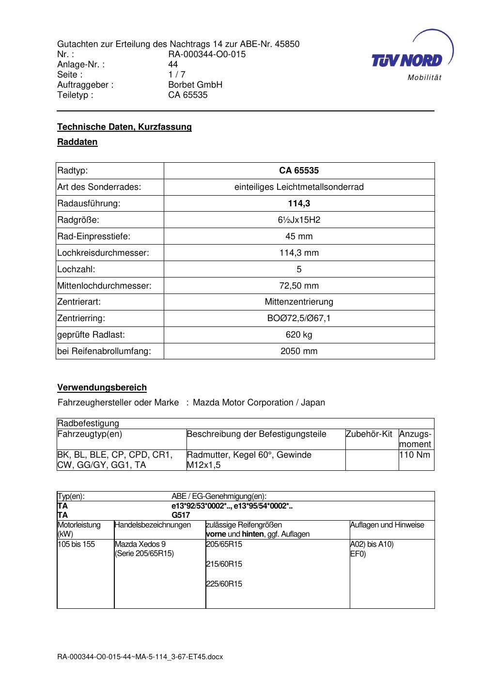 Dieses Gutachten (abe) bezieht sich auf die Alufelge Borbet CA 65535 in der Ausführung ET 0, Mittenloch 0 mm (KBA 45850). Im PDF findest du typischerweise zulässige Reifengrößen, Auflagen/Anbauhinweise und – je nach Dokument – Hinweise zur Eintragung.