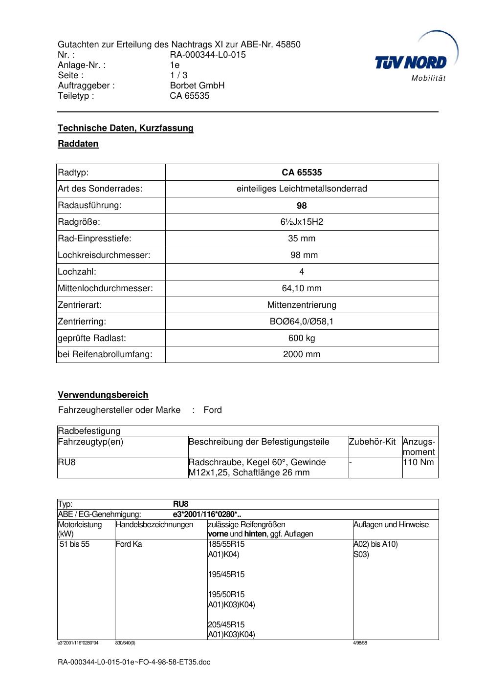 Dieses Gutachten (abe) bezieht sich auf die Alufelge Borbet CA 65535 in der Ausführung ET 0, Mittenloch 0 mm (KBA 45850). Im PDF findest du typischerweise zulässige Reifengrößen, Auflagen/Anbauhinweise und – je nach Dokument – Hinweise zur Eintragung.