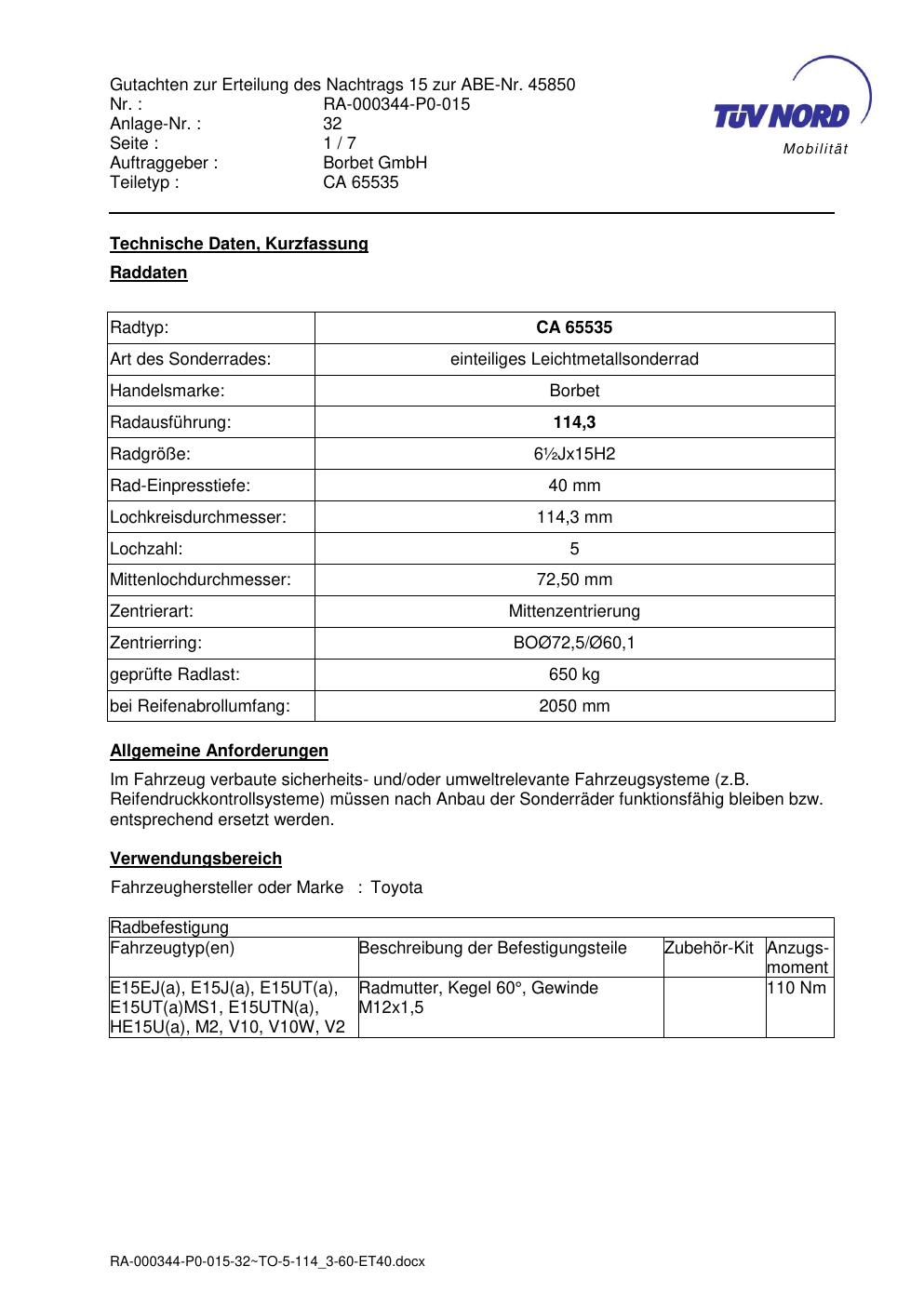 Dieses Gutachten (abe) bezieht sich auf die Alufelge Borbet CA 65535 in der Ausführung ET 0, Mittenloch 0 mm (KBA 45850). Im PDF findest du typischerweise zulässige Reifengrößen, Auflagen/Anbauhinweise und – je nach Dokument – Hinweise zur Eintragung.