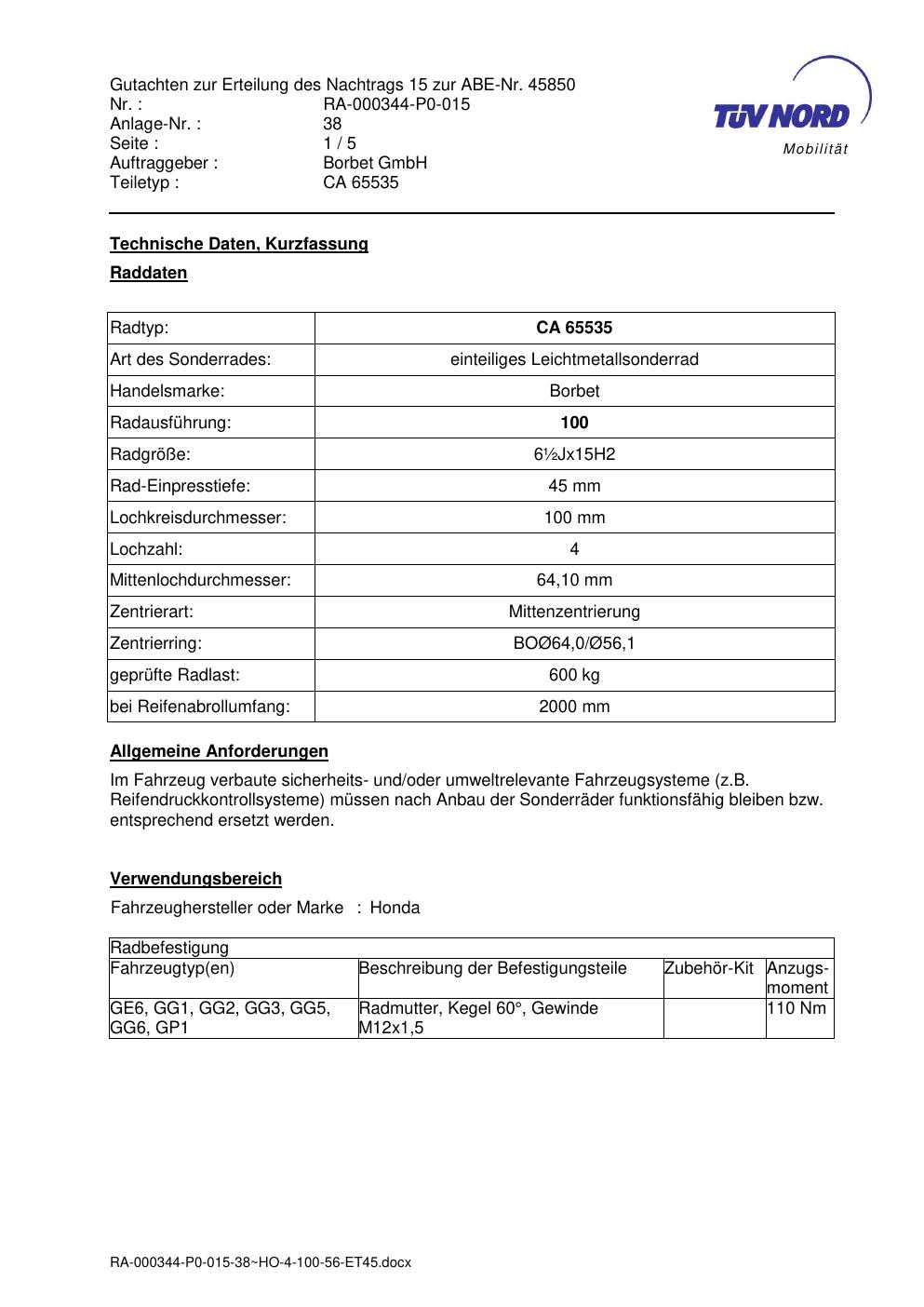 Dieses Gutachten (abe) bezieht sich auf die Alufelge brand-borbet CA 65535 in der Ausführung ET 0, Mittenloch 0 mm (KBA 45850). Im PDF findest du typischerweise zulässige Reifengrößen, Auflagen/Anbauhinweise und – je nach Dokument – Hinweise zur Eintragung.