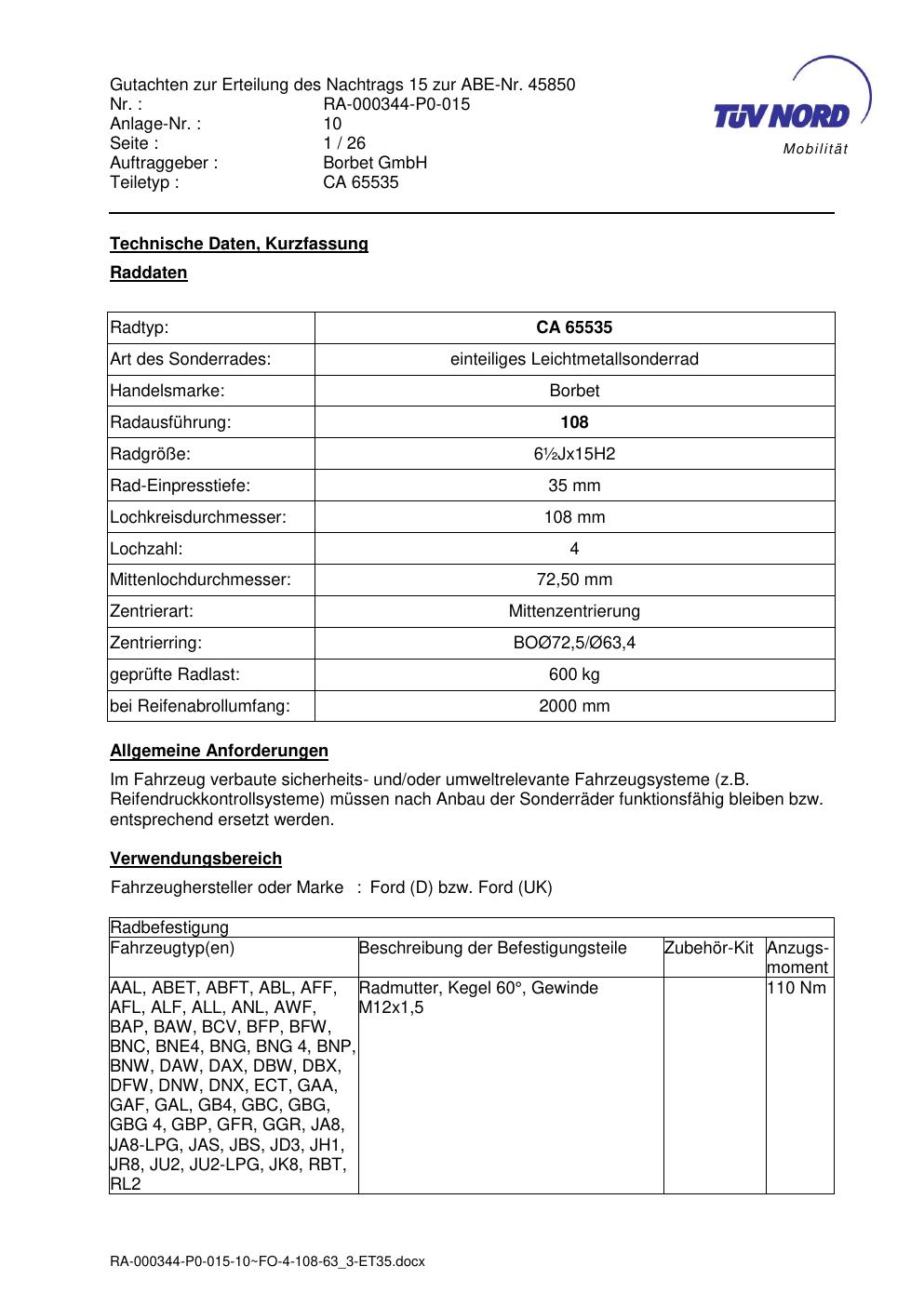 Dieses Gutachten (abe) bezieht sich auf die Alufelge Borbet CA 65535 in der Ausführung ET 0, Mittenloch 0 mm (KBA 45850). Im PDF findest du typischerweise zulässige Reifengrößen, Auflagen/Anbauhinweise und – je nach Dokument – Hinweise zur Eintragung.