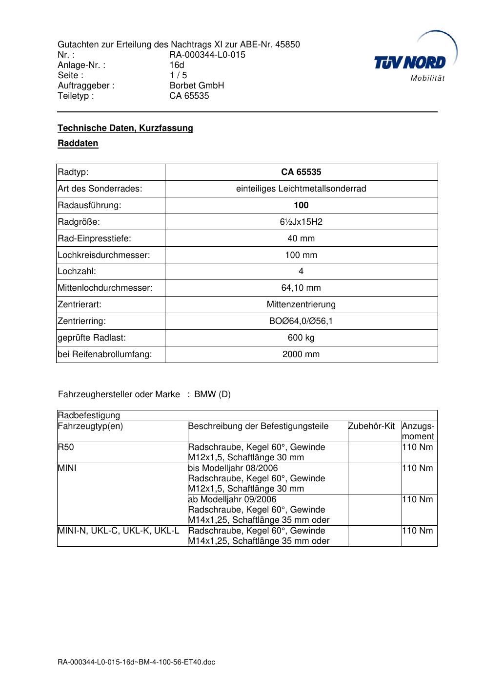Dieses Gutachten (abe) bezieht sich auf die Alufelge Borbet CA 65535 in der Ausführung ET 0, Mittenloch 0 mm (KBA 45850). Im PDF findest du typischerweise zulässige Reifengrößen, Auflagen/Anbauhinweise und – je nach Dokument – Hinweise zur Eintragung.