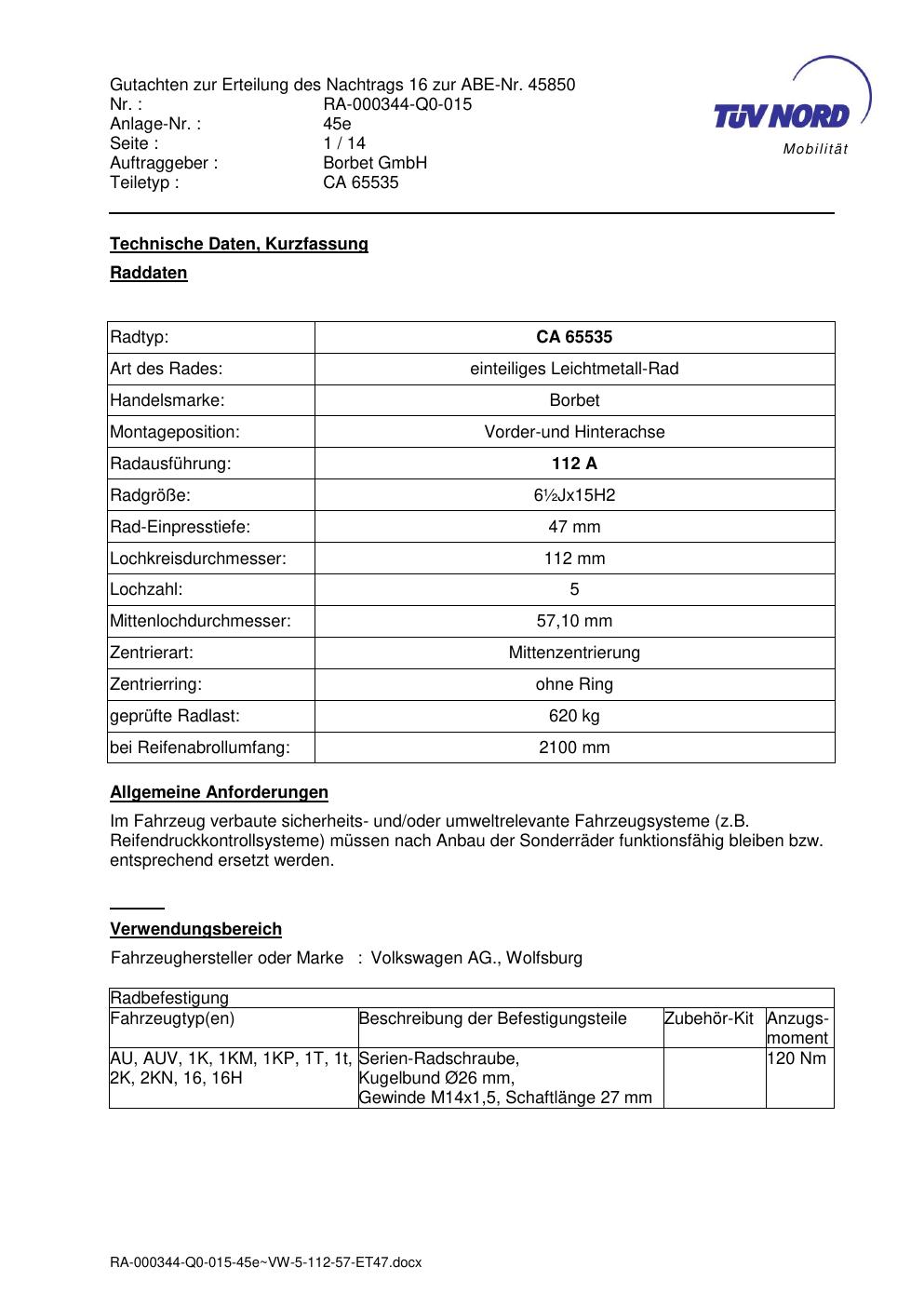 Dieses Gutachten (abe) bezieht sich auf die Alufelge Borbet CA 65535 in der Ausführung ET 0, Mittenloch 0 mm (KBA 45850). Im PDF findest du typischerweise zulässige Reifengrößen, Auflagen/Anbauhinweise und – je nach Dokument – Hinweise zur Eintragung.