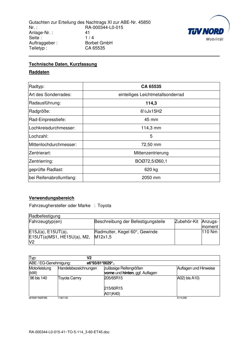 Dieses Gutachten (abe) bezieht sich auf die Alufelge Borbet CA 65535 in der Ausführung ET 0, Mittenloch 0 mm (KBA 45850). Im PDF findest du typischerweise zulässige Reifengrößen, Auflagen/Anbauhinweise und – je nach Dokument – Hinweise zur Eintragung.