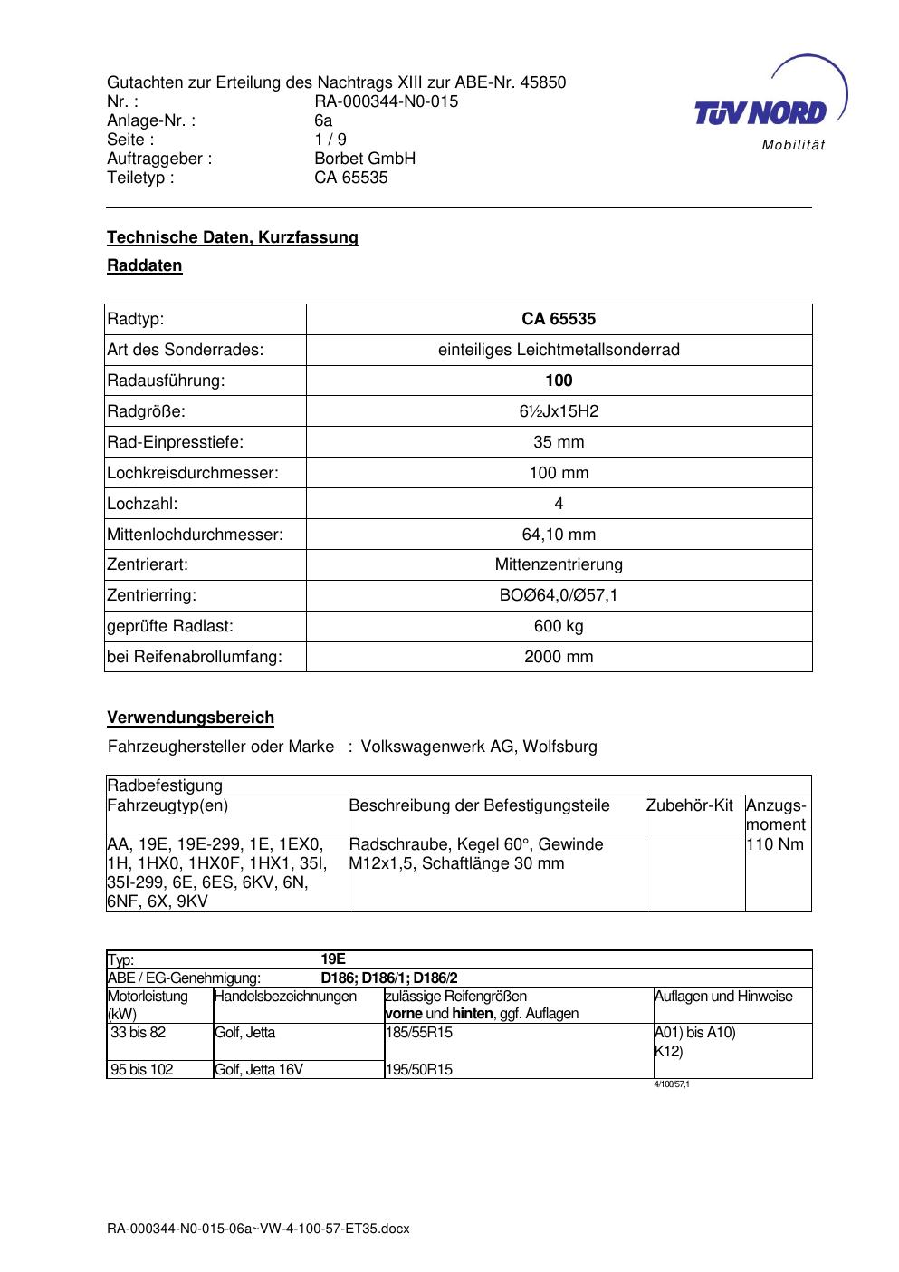Dieses Gutachten (abe) bezieht sich auf die Alufelge Borbet CA 65535 in der Ausführung ET 0, Mittenloch 0 mm (KBA 45850). Im PDF findest du typischerweise zulässige Reifengrößen, Auflagen/Anbauhinweise und – je nach Dokument – Hinweise zur Eintragung.
