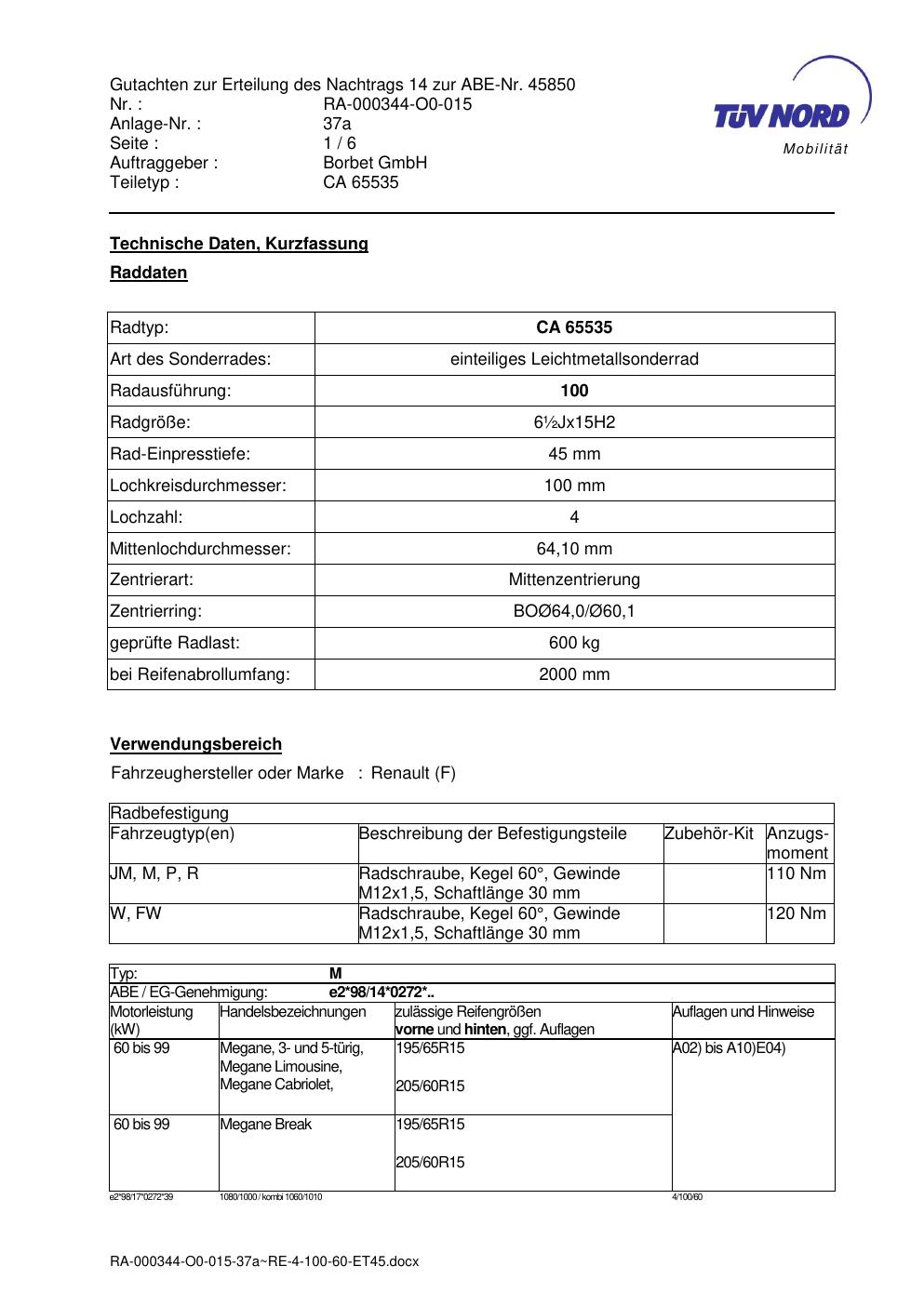 Dieses Gutachten (abe) bezieht sich auf die Alufelge Borbet CA 65535 in der Ausführung ET 0, Mittenloch 0 mm (KBA 45850). Im PDF findest du typischerweise zulässige Reifengrößen, Auflagen/Anbauhinweise und – je nach Dokument – Hinweise zur Eintragung.