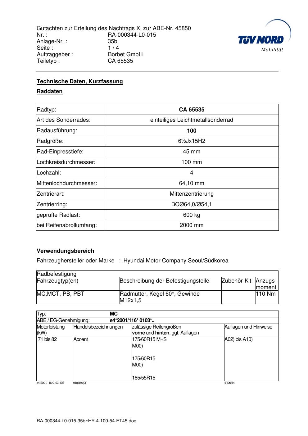 Dieses Gutachten (abe) bezieht sich auf die Alufelge Borbet CA 65535 in der Ausführung ET 0, Mittenloch 0 mm (KBA 45850). Im PDF findest du typischerweise zulässige Reifengrößen, Auflagen/Anbauhinweise und – je nach Dokument – Hinweise zur Eintragung.