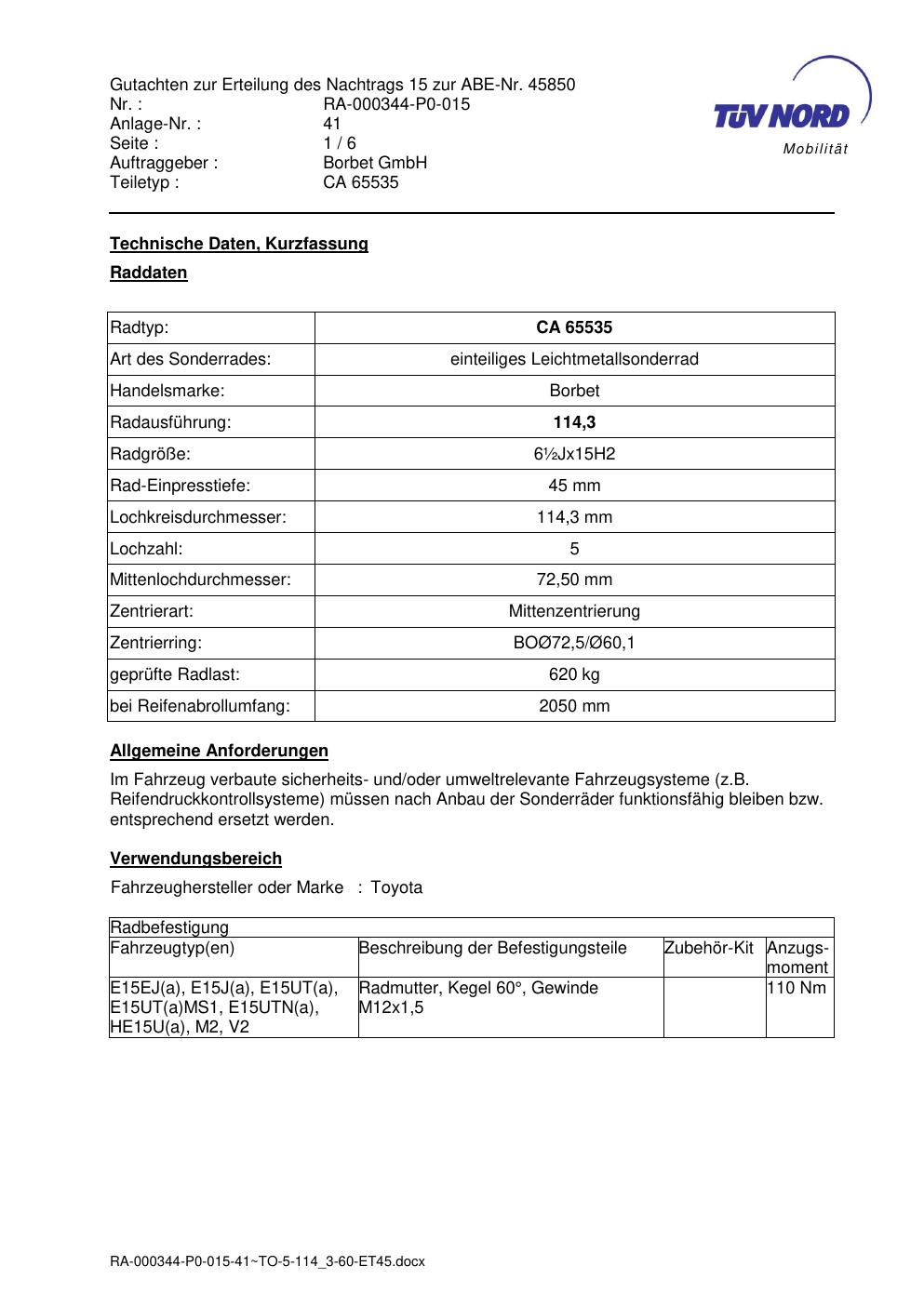 Dieses Gutachten (abe) bezieht sich auf die Alufelge Borbet CA 65535 in der Ausführung ET 0, Mittenloch 0 mm (KBA 45850). Im PDF findest du typischerweise zulässige Reifengrößen, Auflagen/Anbauhinweise und – je nach Dokument – Hinweise zur Eintragung.