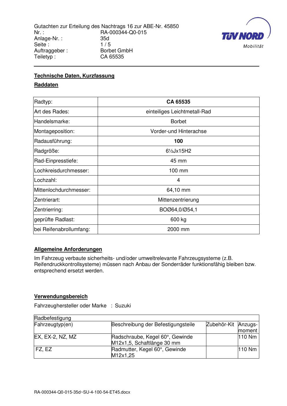Dieses Gutachten (abe) bezieht sich auf die Alufelge Borbet CA 65535 in der Ausführung ET 0, Mittenloch 0 mm (KBA 45850). Im PDF findest du typischerweise zulässige Reifengrößen, Auflagen/Anbauhinweise und – je nach Dokument – Hinweise zur Eintragung.