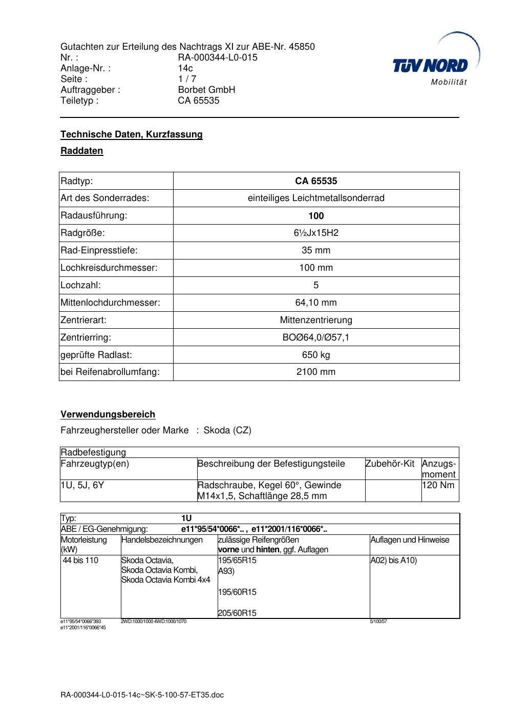 Dieses Gutachten (abe) bezieht sich auf die Alufelge Borbet CA 65535 in der Ausführung ET 0, Mittenloch 0 mm (KBA 45850). Im PDF findest du typischerweise zulässige Reifengrößen, Auflagen/Anbauhinweise und – je nach Dokument – Hinweise zur Eintragung.