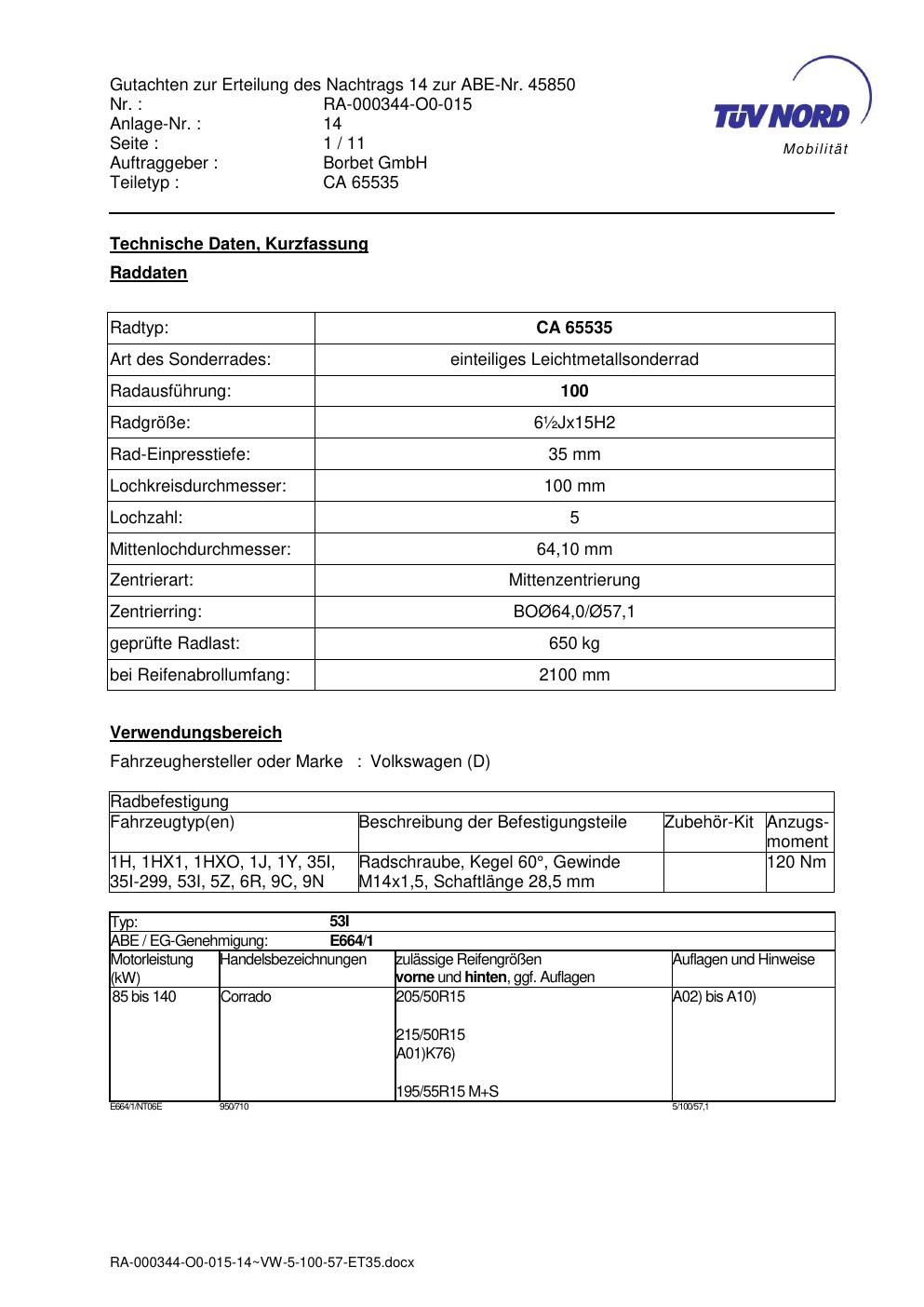 Dieses Gutachten (abe) bezieht sich auf die Alufelge brand-borbet CA 65535 in der Ausführung ET 0, Mittenloch 0 mm (KBA 45850). Im PDF findest du typischerweise zulässige Reifengrößen, Auflagen/Anbauhinweise und – je nach Dokument – Hinweise zur Eintragung.