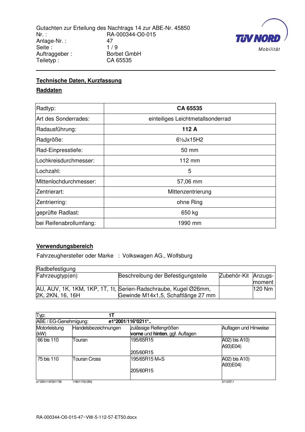 Dieses Gutachten (abe) bezieht sich auf die Alufelge Borbet CA 65535 in der Ausführung ET 0, Mittenloch 0 mm (KBA 45850). Im PDF findest du typischerweise zulässige Reifengrößen, Auflagen/Anbauhinweise und – je nach Dokument – Hinweise zur Eintragung.
