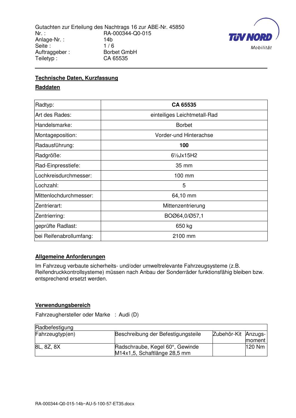 Dieses Gutachten (abe) bezieht sich auf die Alufelge Borbet CA 65535 in der Ausführung ET 0, Mittenloch 0 mm (KBA 45850). Im PDF findest du typischerweise zulässige Reifengrößen, Auflagen/Anbauhinweise und – je nach Dokument – Hinweise zur Eintragung.