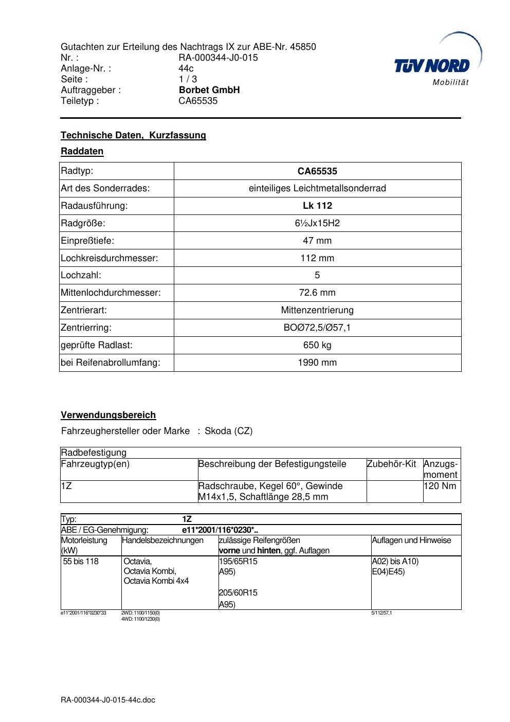 Dieses Gutachten (abe) bezieht sich auf die Alufelge Borbet CA65535 in der Ausführung ET 0, Mittenloch 0 mm (KBA 45850). Im PDF findest du typischerweise zulässige Reifengrößen, Auflagen/Anbauhinweise und – je nach Dokument – Hinweise zur Eintragung.
