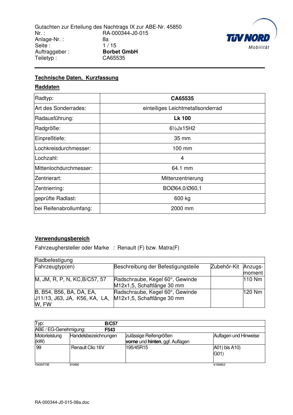 Dieses Gutachten (abe) bezieht sich auf die Alufelge brand-borbet CA65535 in der Ausführung ET 0, Mittenloch 0 mm (KBA 45850). Im PDF findest du typischerweise zulässige Reifengrößen, Auflagen/Anbauhinweise und – je nach Dokument – Hinweise zur Eintragung.