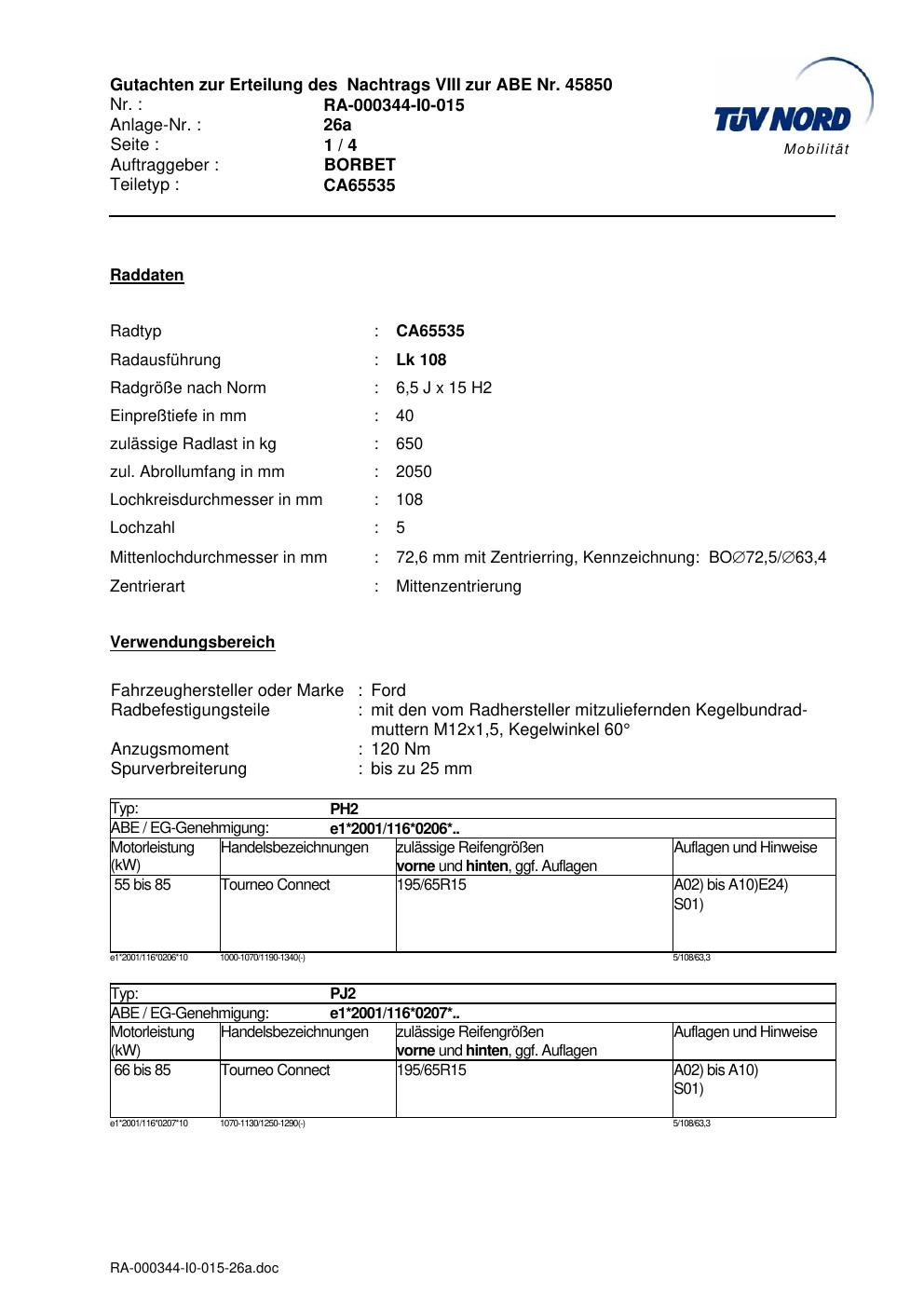 Dieses Gutachten (abe) bezieht sich auf die Alufelge Borbet CA65535 in der Ausführung 6.5Jx15 ET 0, Mittenloch 0 mm (KBA 45850). Im PDF findest du typischerweise zulässige Reifengrößen, Auflagen/Anbauhinweise und – je nach Dokument – Hinweise zur Eintragung.