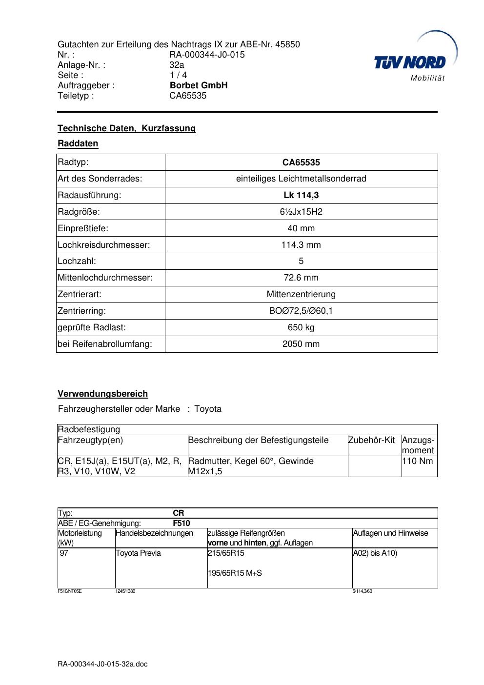Dieses Gutachten (abe) bezieht sich auf die Alufelge Borbet CA65535 in der Ausführung ET 0, Mittenloch 0 mm (KBA 45850). Im PDF findest du typischerweise zulässige Reifengrößen, Auflagen/Anbauhinweise und – je nach Dokument – Hinweise zur Eintragung.