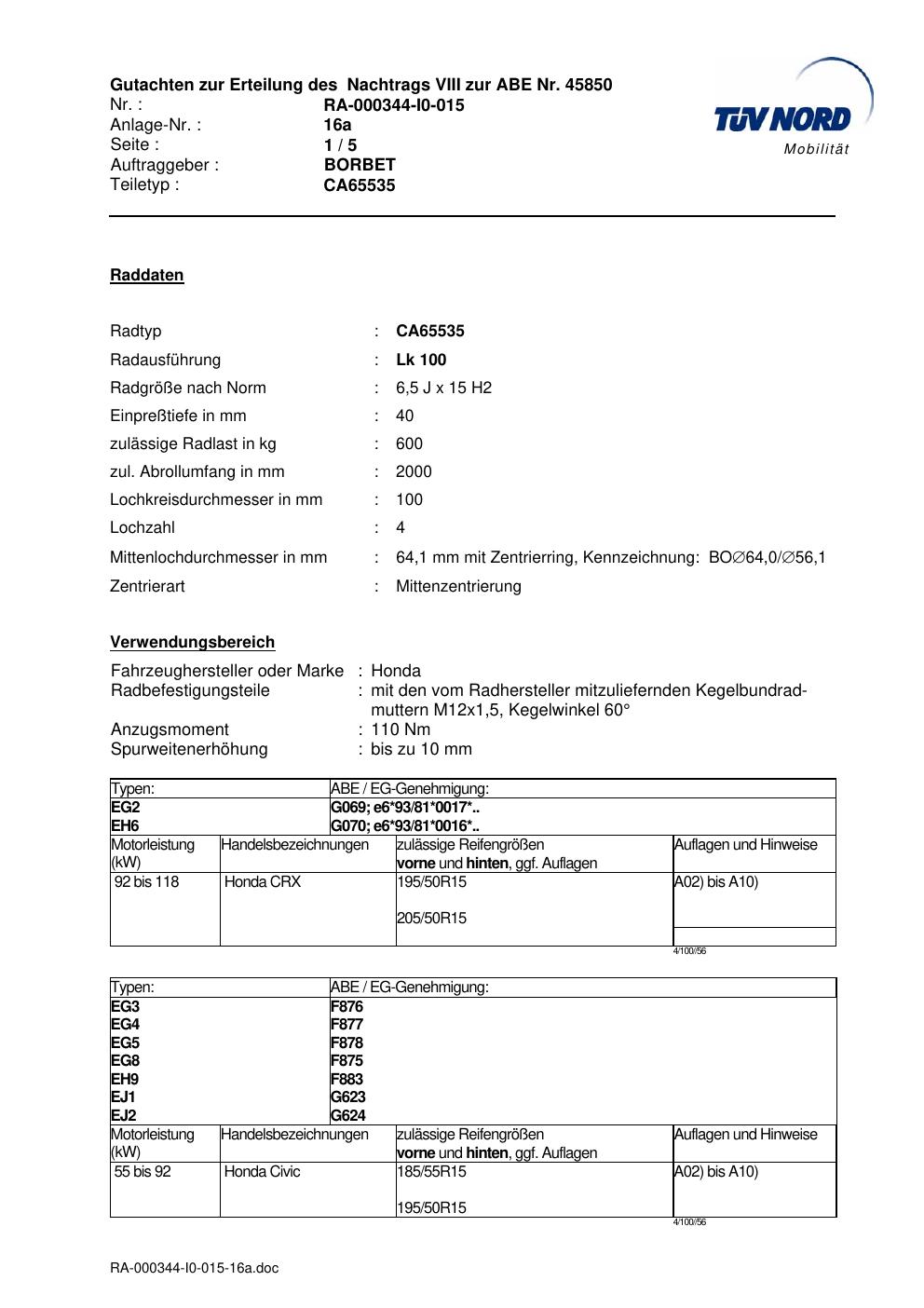 - Borbet CA65535 – 6.5Jx15 ET0.0 (KBA 45850)