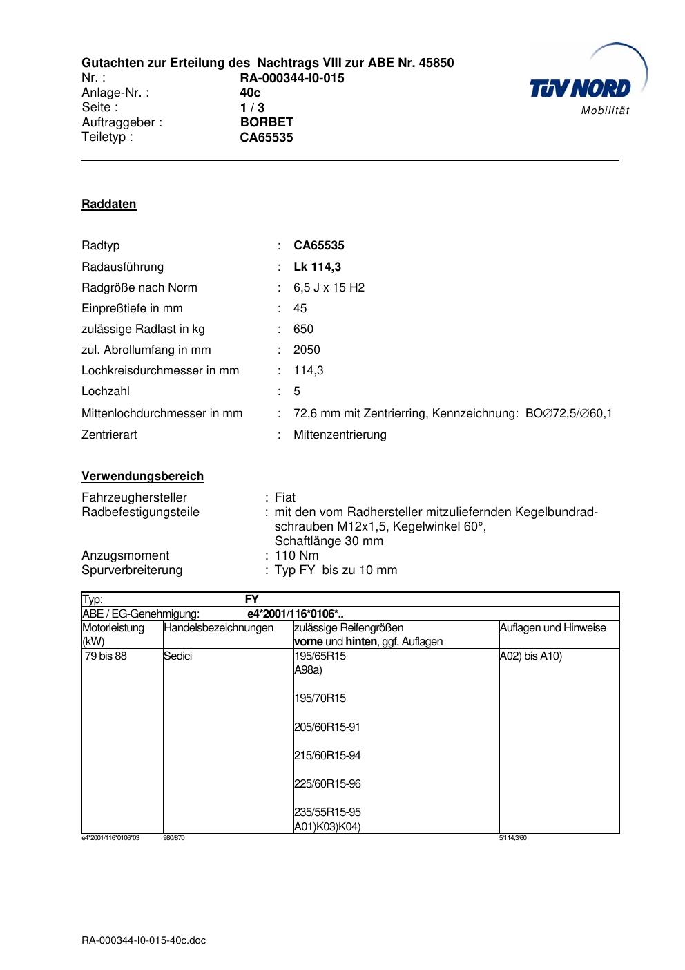 Dieses Gutachten (abe) bezieht sich auf die Alufelge brand-borbet CA65535 in der Ausführung 6.5Jx15 ET 0, Mittenloch 0 mm (KBA 45850). Im PDF findest du typischerweise zulässige Reifengrößen, Auflagen/Anbauhinweise und – je nach Dokument – Hinweise zur Eintragung.