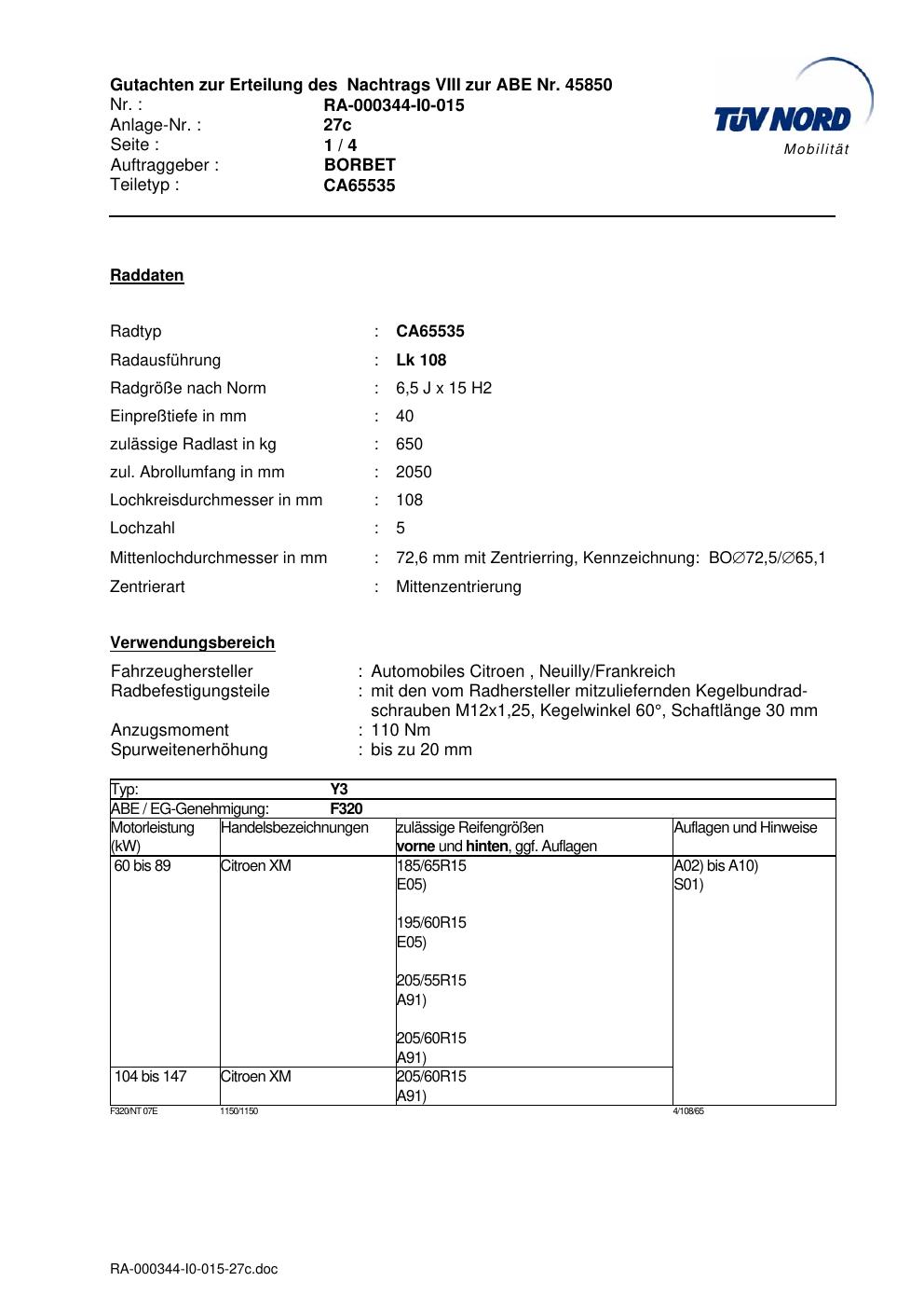 Dieses Gutachten (abe) bezieht sich auf die Alufelge Borbet CA65535 in der Ausführung 6.5Jx15 ET 0, Mittenloch 0 mm (KBA 45850). Im PDF findest du typischerweise zulässige Reifengrößen, Auflagen/Anbauhinweise und – je nach Dokument – Hinweise zur Eintragung.