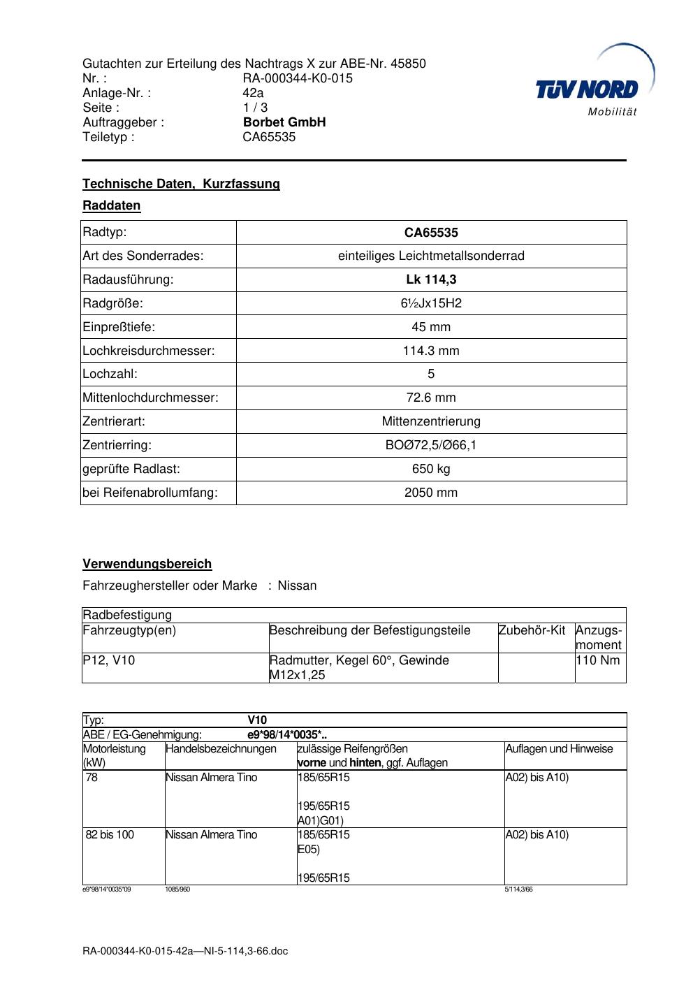Dieses Gutachten (abe) bezieht sich auf die Alufelge Borbet CA65535 in der Ausführung ET 0, Mittenloch 0 mm (KBA 45850). Im PDF findest du typischerweise zulässige Reifengrößen, Auflagen/Anbauhinweise und – je nach Dokument – Hinweise zur Eintragung.