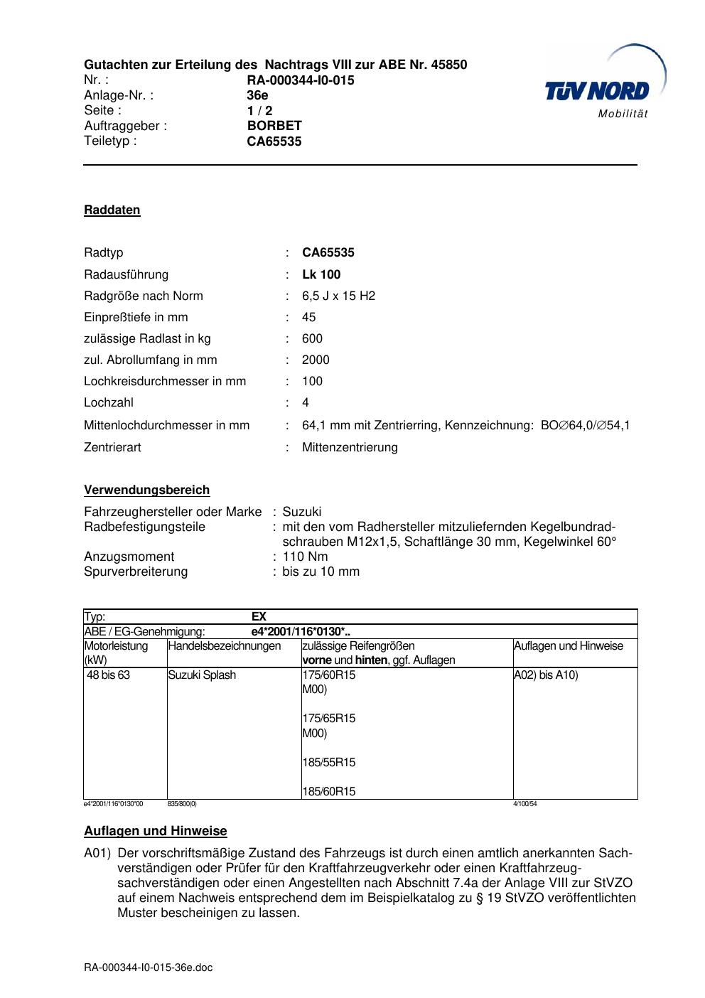 Dieses Gutachten (abe) bezieht sich auf die Alufelge Borbet CA65535 in der Ausführung 6.5Jx15 ET 0, Mittenloch 0 mm (KBA 45850). Im PDF findest du typischerweise zulässige Reifengrößen, Auflagen/Anbauhinweise und – je nach Dokument – Hinweise zur Eintragung.