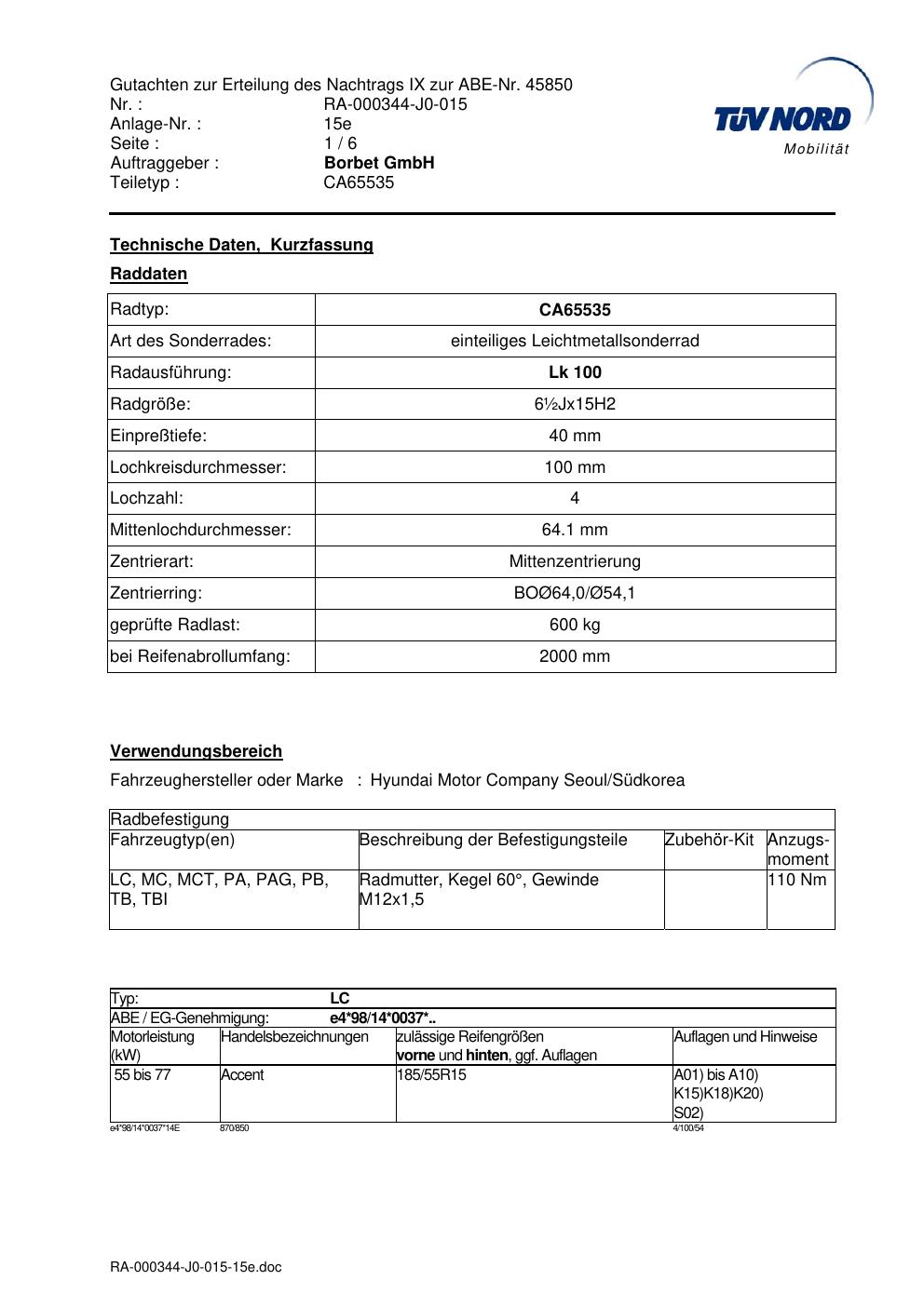 Dieses Gutachten (abe) bezieht sich auf die Alufelge brand-borbet CA65535 in der Ausführung ET 0, Mittenloch 0 mm (KBA 45850). Im PDF findest du typischerweise zulässige Reifengrößen, Auflagen/Anbauhinweise und – je nach Dokument – Hinweise zur Eintragung.