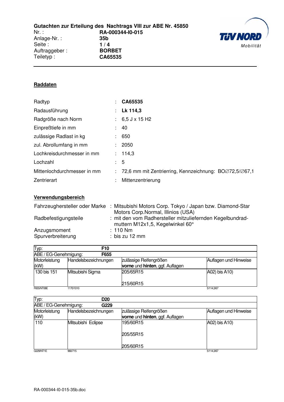 Dieses Gutachten (abe) bezieht sich auf die Alufelge Borbet CA65535 in der Ausführung 6.5Jx15 ET 0, Mittenloch 0 mm (KBA 45850). Im PDF findest du typischerweise zulässige Reifengrößen, Auflagen/Anbauhinweise und – je nach Dokument – Hinweise zur Eintragung.