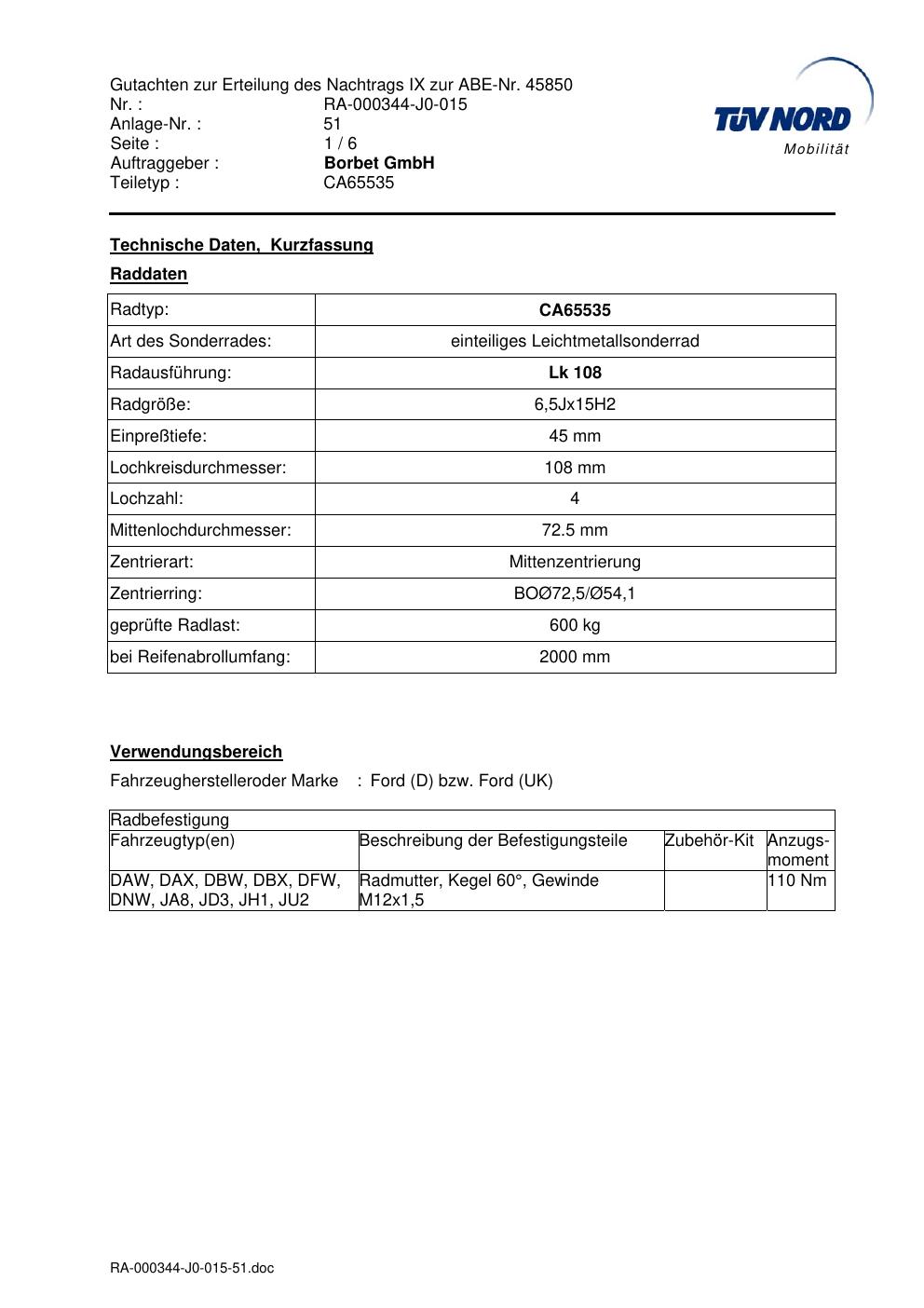 Dieses Gutachten (abe) bezieht sich auf die Alufelge brand-borbet CA65535 in der Ausführung 6.5Jx15 ET 0, Mittenloch 0 mm (KBA 45850). Im PDF findest du typischerweise zulässige Reifengrößen, Auflagen/Anbauhinweise und – je nach Dokument – Hinweise zur Eintragung.
