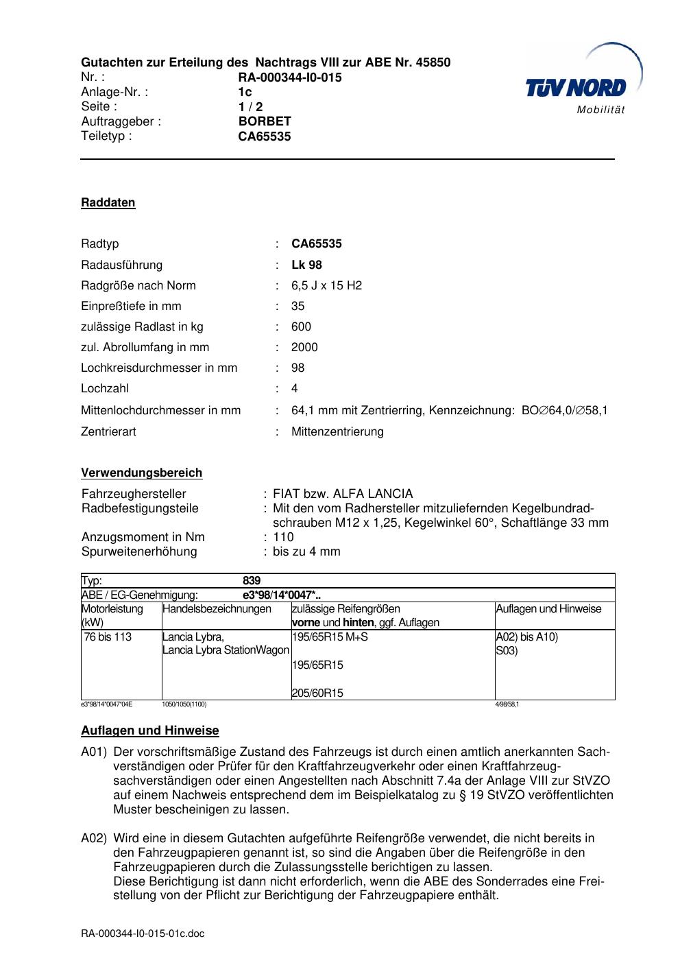 Dieses Gutachten (abe) bezieht sich auf die Alufelge Borbet CA65535 in der Ausführung 6.5Jx15 ET 0, Mittenloch 0 mm (KBA 45850). Im PDF findest du typischerweise zulässige Reifengrößen, Auflagen/Anbauhinweise und – je nach Dokument – Hinweise zur Eintragung.