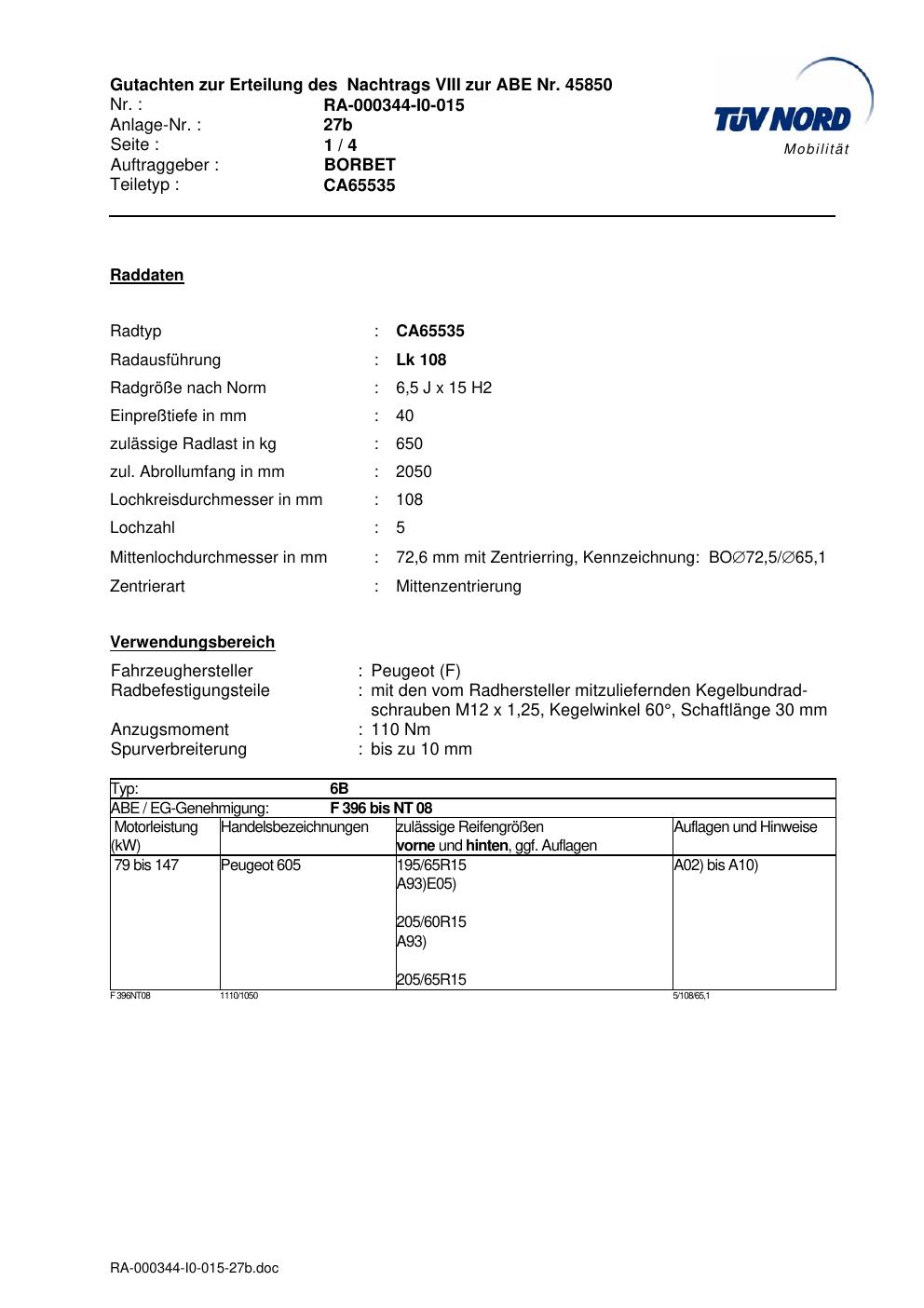 Dieses Gutachten (abe) bezieht sich auf die Alufelge Borbet CA65535 in der Ausführung 6.5Jx15 ET 0, Mittenloch 0 mm (KBA 45850). Im PDF findest du typischerweise zulässige Reifengrößen, Auflagen/Anbauhinweise und – je nach Dokument – Hinweise zur Eintragung.