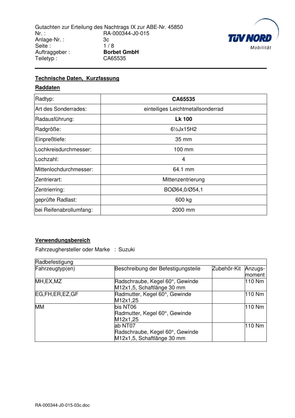 Dieses Gutachten (abe) bezieht sich auf die Alufelge Borbet CA65535 in der Ausführung ET 0, Mittenloch 0 mm (KBA 45850). Im PDF findest du typischerweise zulässige Reifengrößen, Auflagen/Anbauhinweise und – je nach Dokument – Hinweise zur Eintragung.