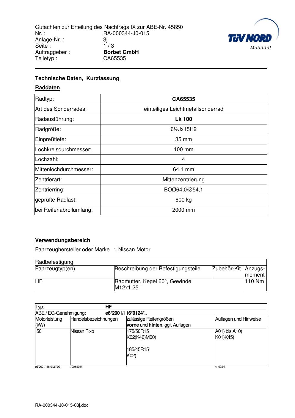 Dieses Gutachten (abe) bezieht sich auf die Alufelge Borbet CA65535 in der Ausführung ET 0, Mittenloch 0 mm (KBA 45850). Im PDF findest du typischerweise zulässige Reifengrößen, Auflagen/Anbauhinweise und – je nach Dokument – Hinweise zur Eintragung.