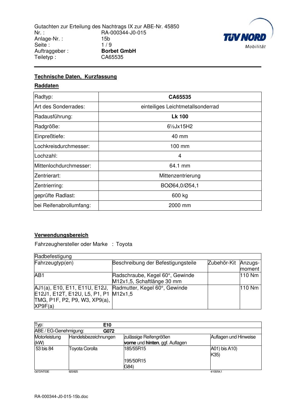 Dieses Gutachten (abe) bezieht sich auf die Alufelge Borbet CA65535 in der Ausführung ET 0, Mittenloch 0 mm (KBA 45850). Im PDF findest du typischerweise zulässige Reifengrößen, Auflagen/Anbauhinweise und – je nach Dokument – Hinweise zur Eintragung.