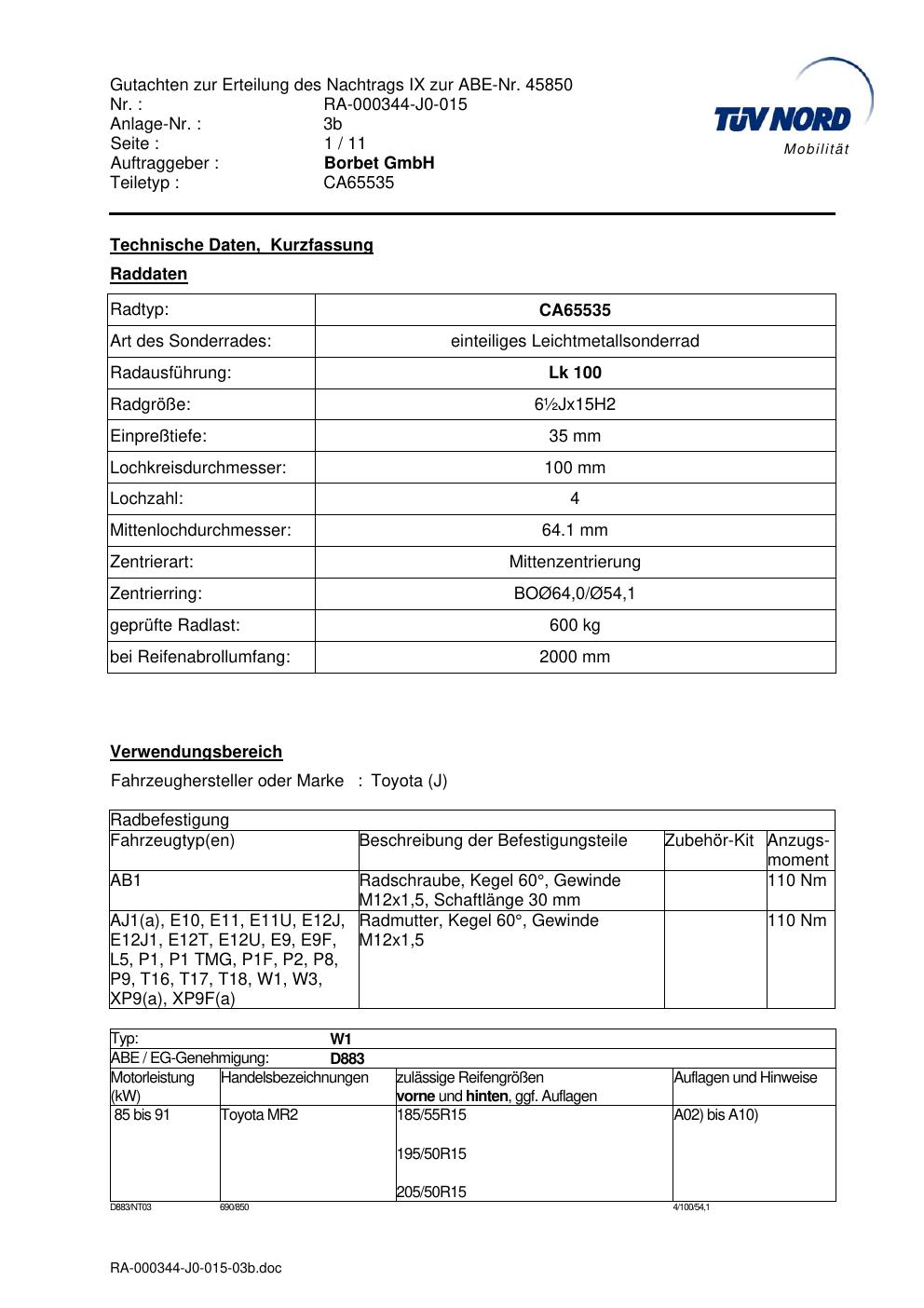 Dieses Gutachten (abe) bezieht sich auf die Alufelge Borbet CA65535 in der Ausführung ET 0, Mittenloch 0 mm (KBA 45850). Im PDF findest du typischerweise zulässige Reifengrößen, Auflagen/Anbauhinweise und – je nach Dokument – Hinweise zur Eintragung.