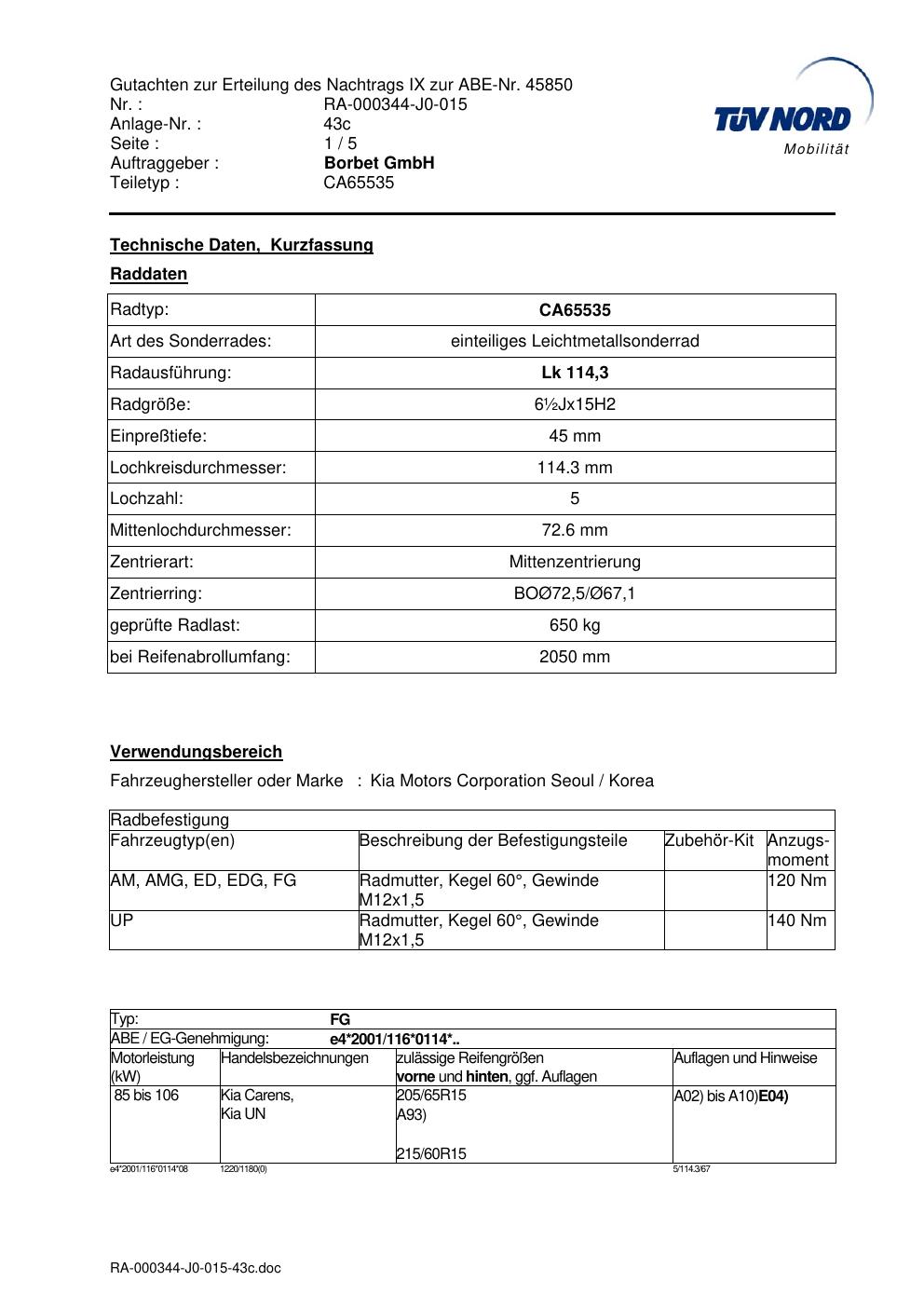 Dieses Gutachten (abe) bezieht sich auf die Alufelge brand-borbet CA65535 in der Ausführung ET 0, Mittenloch 0 mm (KBA 45850). Im PDF findest du typischerweise zulässige Reifengrößen, Auflagen/Anbauhinweise und – je nach Dokument – Hinweise zur Eintragung.