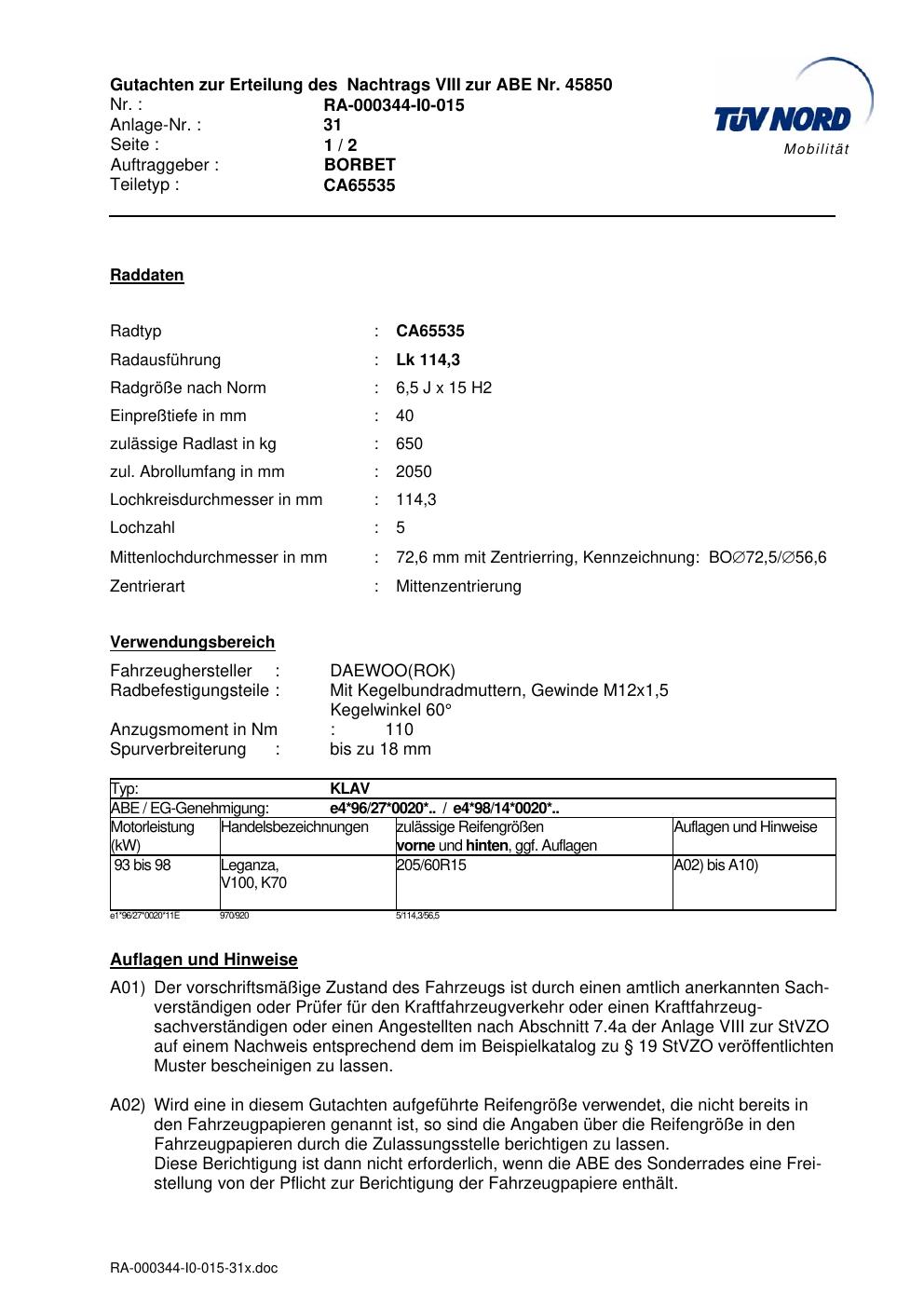 Dieses Gutachten (abe) bezieht sich auf die Alufelge Borbet CA65535 in der Ausführung 6.5Jx15 ET 0, Mittenloch 0 mm (KBA 45850). Im PDF findest du typischerweise zulässige Reifengrößen, Auflagen/Anbauhinweise und – je nach Dokument – Hinweise zur Eintragung.