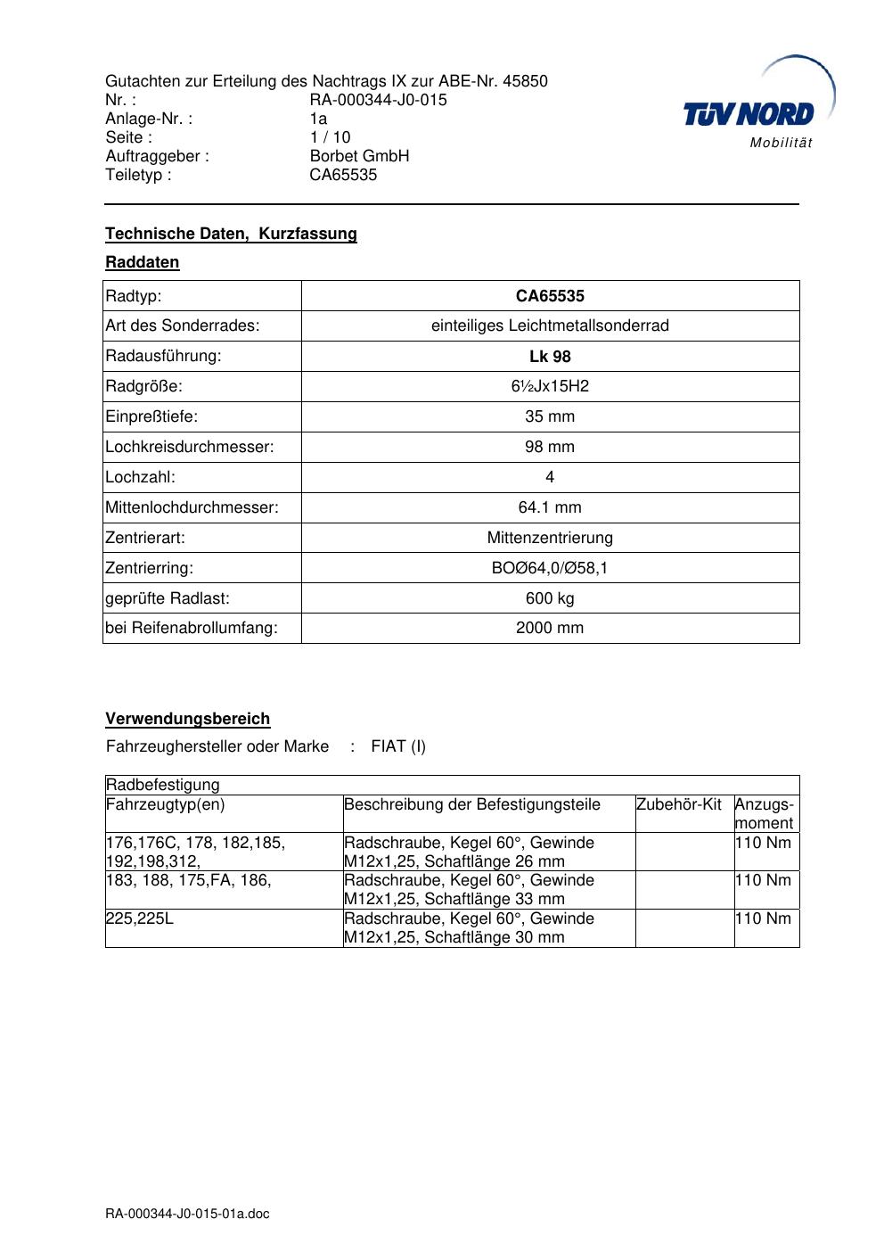 Dieses Gutachten (abe) bezieht sich auf die Alufelge brand-borbet CA65535 in der Ausführung ET 0, Mittenloch 0 mm (KBA 45850). Im PDF findest du typischerweise zulässige Reifengrößen, Auflagen/Anbauhinweise und – je nach Dokument – Hinweise zur Eintragung.